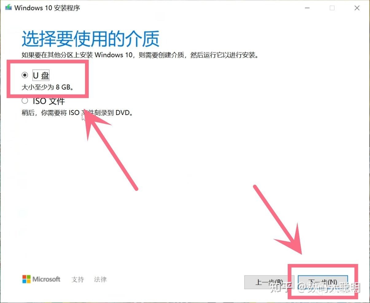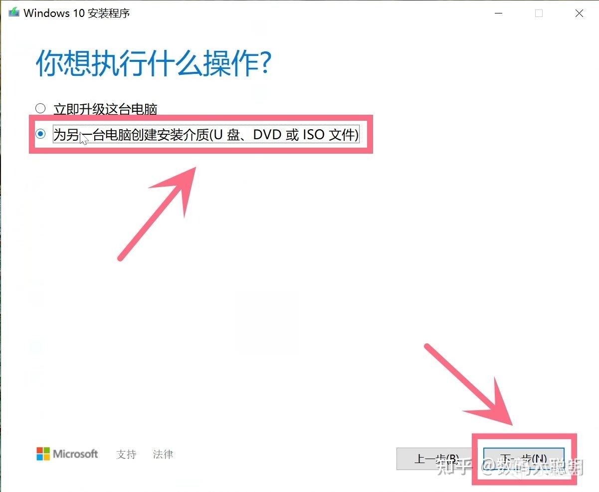 窗口切換後,一般默認的選項都是「立即升級這臺電腦」,我們要選擇「…安裝介質」,然後點擊「下一步」