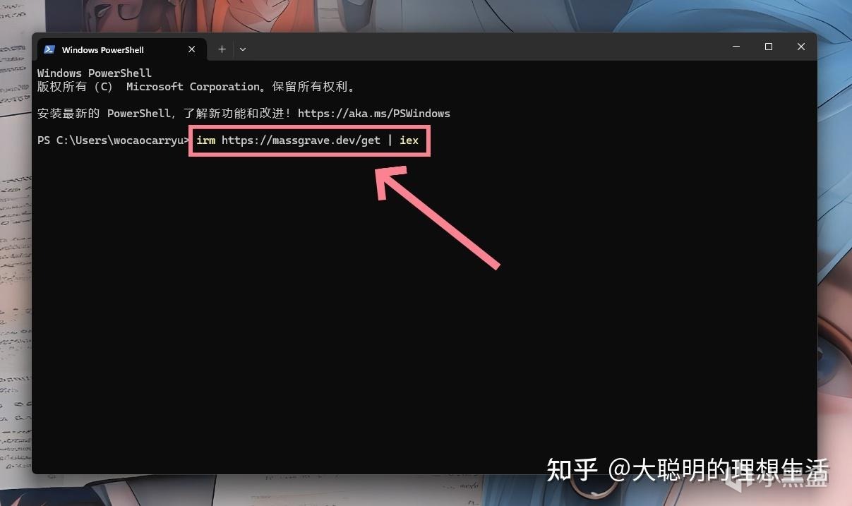 在彈出的框框中的位置,輸入一下代碼【irm https://massgrave.dev/get | iex】,這裏很多小夥伴會出錯,我直接用文字代替——輸入法選擇英文格式,irm空格https://massgrave.dev/get空格(shift+回車鍵上面的按鍵就是:|)空格iex。