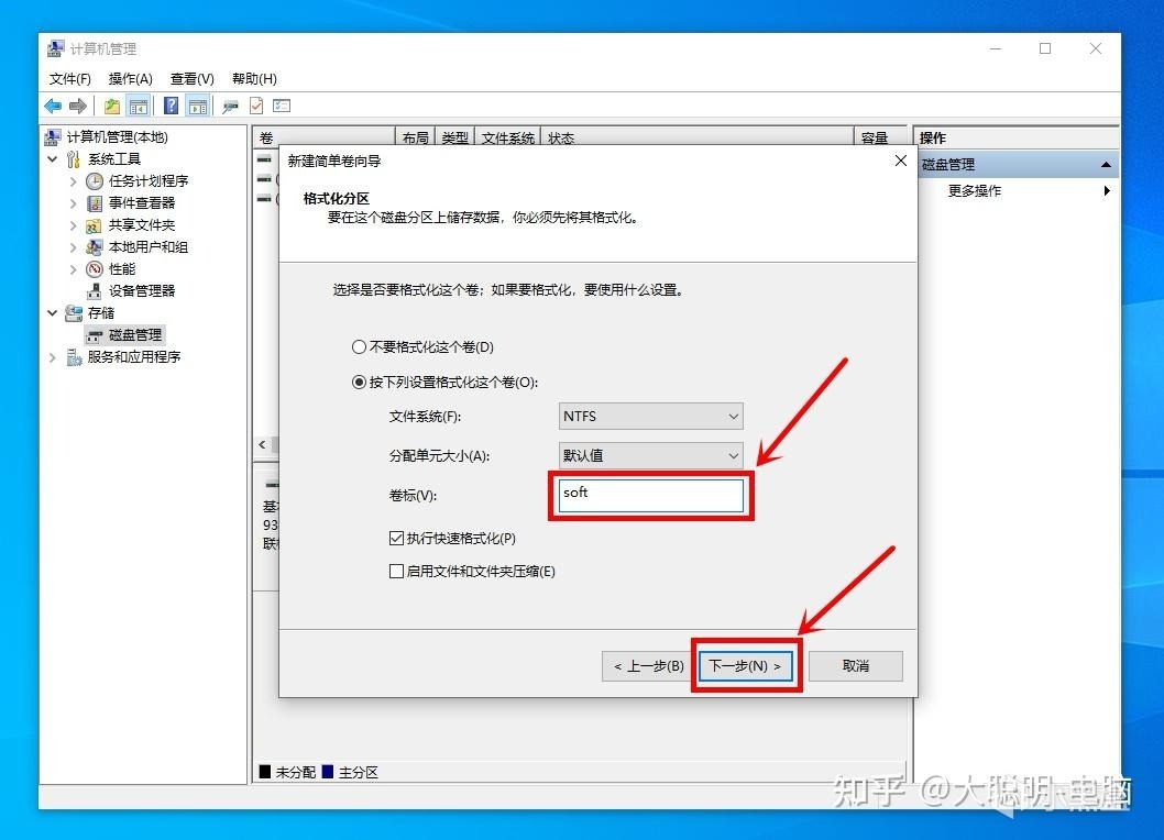 當窗口切換到這裏需要注意,這裏最後一個選項的「卷標」,這就是我們給創造出來的新盤起的名字,可以隨意使用中英文代替。需要注意的是,某些程序,就是軟件、遊戲的安裝是要求卷標爲全英文,所以我一般用soft、work來代替;改好卷標後,點擊下一步;