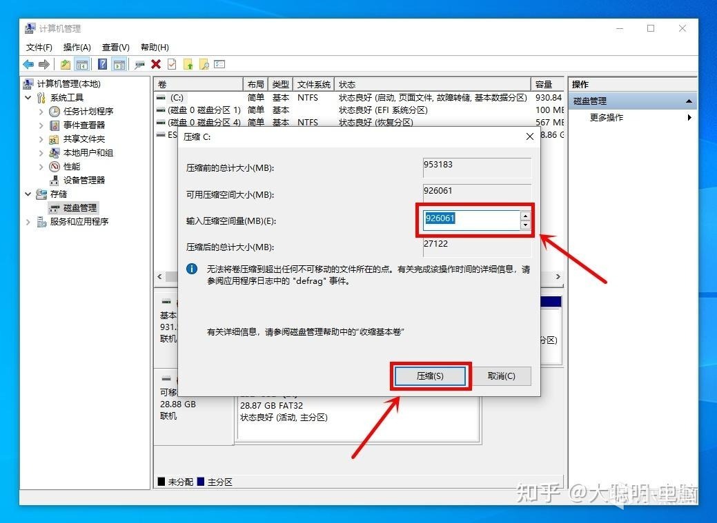 注意彈出的窗口中自上而下第三個默認框中的可修改數字,該數字涉及我們想要分出來的磁盤大小。以1024爲計量單位,想將930GB的C盤分出一塊100GB的D盤,請用計算器計算「1024×100」,得出「102400」,得出的數字直接手動替換第三個框的數字;接着點壓縮; 這裏我保留100GB的C盤,所以分出的D盤空間即830GB;
