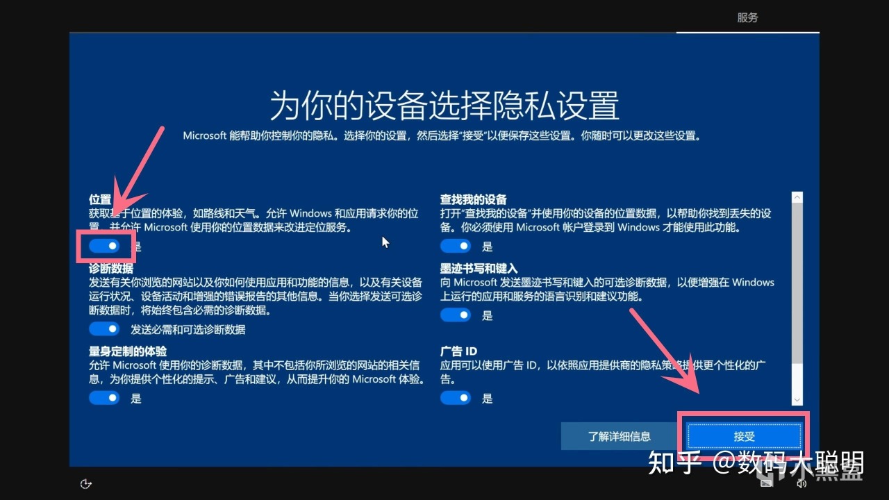 隱私設置上,我個人習慣將所有的「是」選項取消,然後點擊「接受」