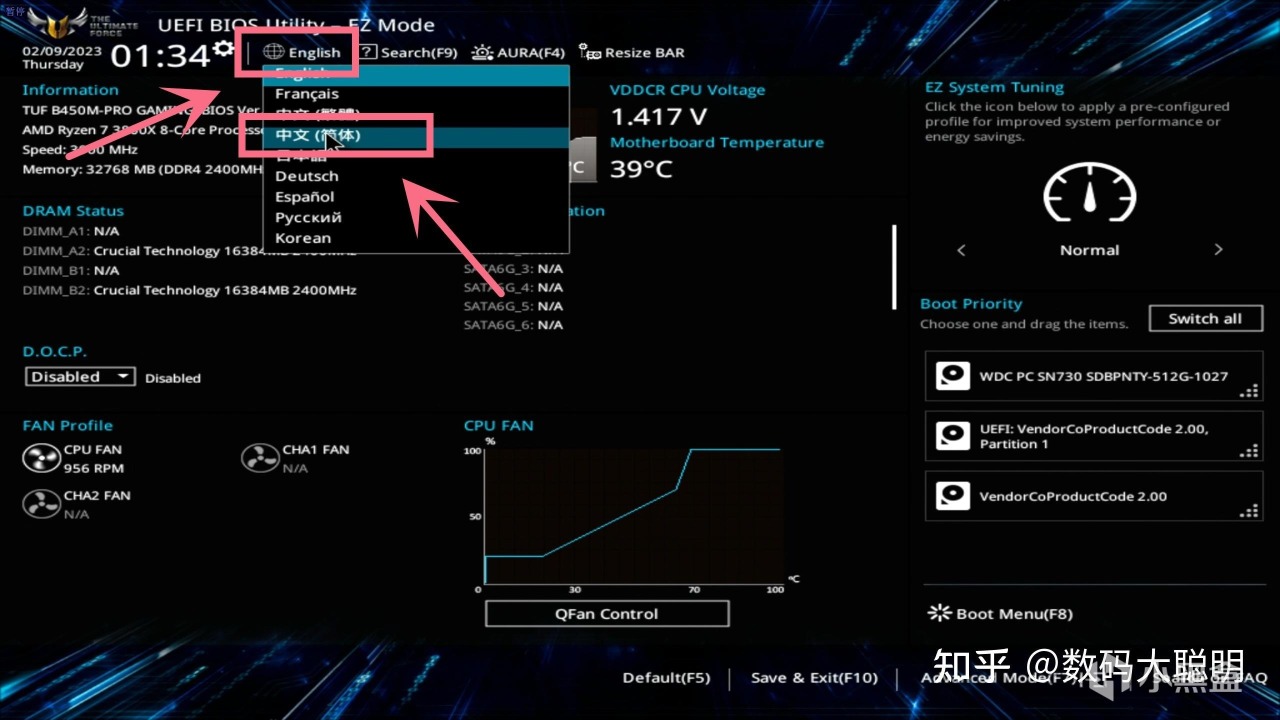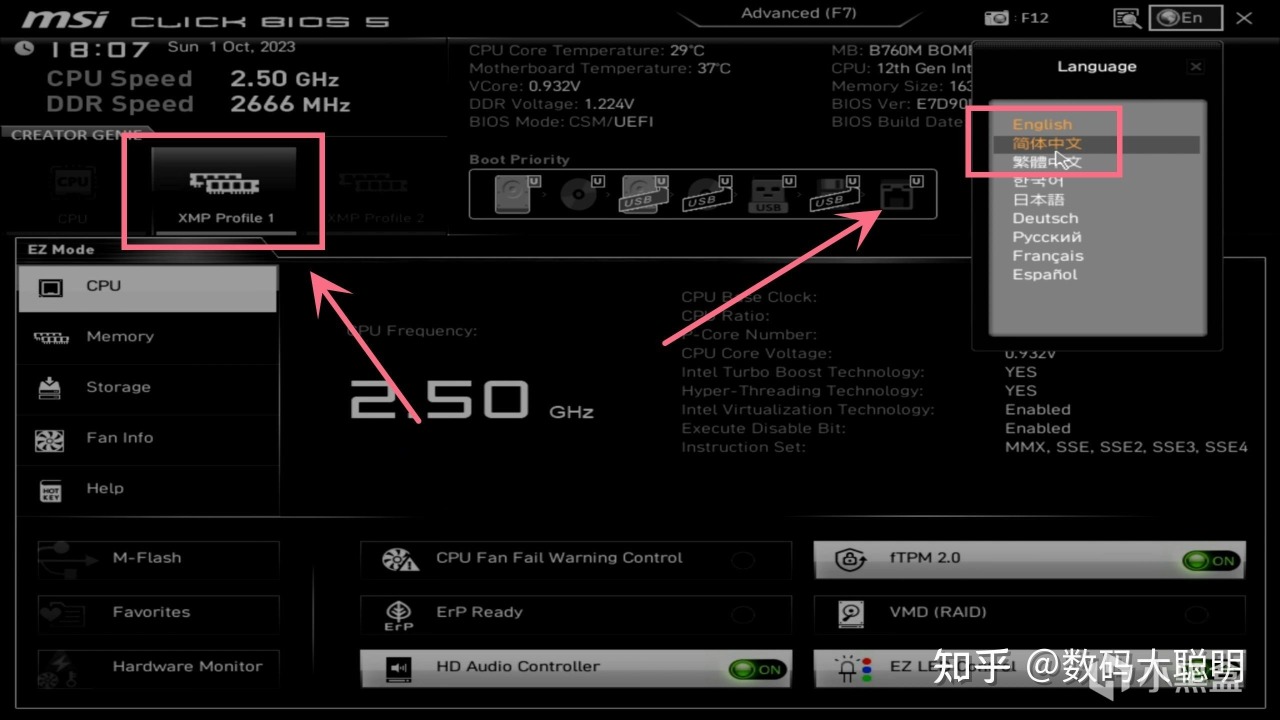選擇簡體中文後,注意左邊的模塊,鼠標點擊一下「XMP Profile」,這裏是開始內存自動XMP