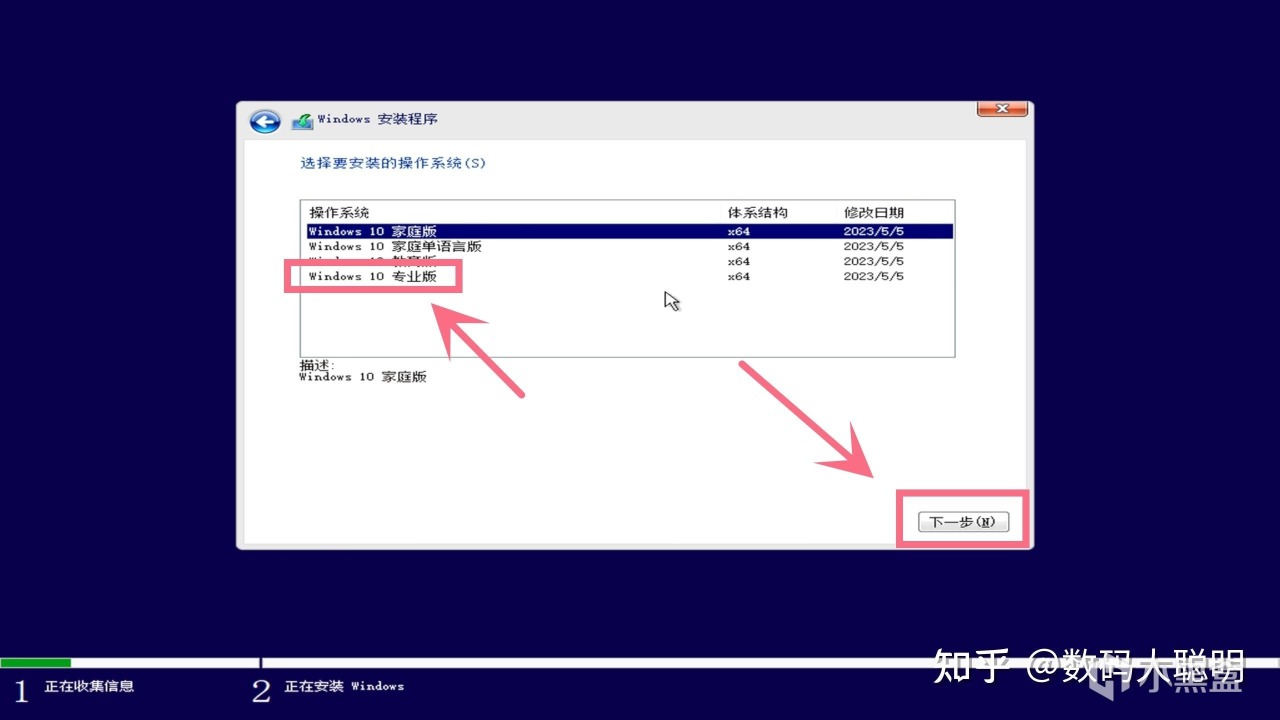 這裏一般有4個Win10系統版本供你選擇,我是直接鼠標選擇「專業版」,然後點擊「下一步」