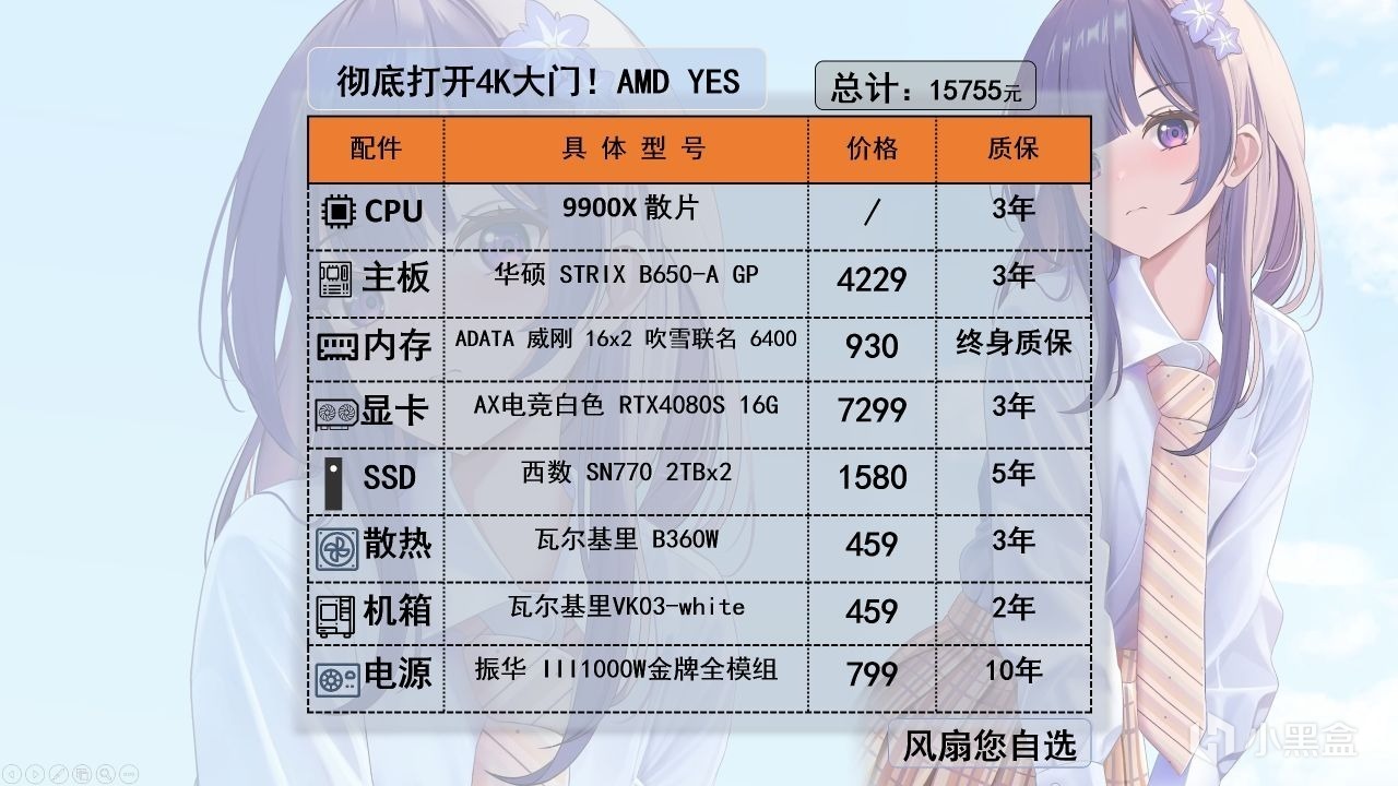 CPU和主板一对得力的组合,显卡方面,白色的ax4080s 带屏幕显示优雅与高贵,7299的价格我相信你们买肯定还能更低(显卡性能方面,,,都4080s了,打游戏再失误就是自己的问题辣)