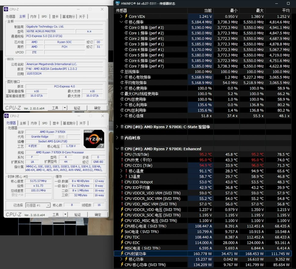 ▲完全解鎖功率限制的情況下,銳龍7 9700X的滿載功率達到160W左右,全核頻率接近5.2GHz