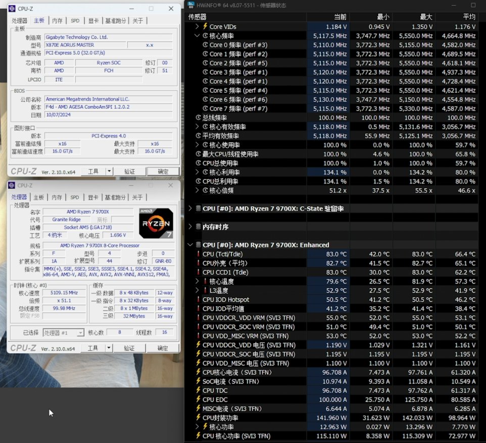 首先看看開啓105W TDP模式後銳龍7 9700X的頻率與溫度。可以看到,在滿載考機狀態下,它的封裝功率保持在142W左右,滿載溫度保持在83℃,全核頻率從65W TDP下的4.2GHz左右猛增到5.1GHz出頭。雖然說溫度確實有所增加,但離95℃的溫度牆上限還是頗有些距離的,對散熱的壓力自然比完全解鎖更小。