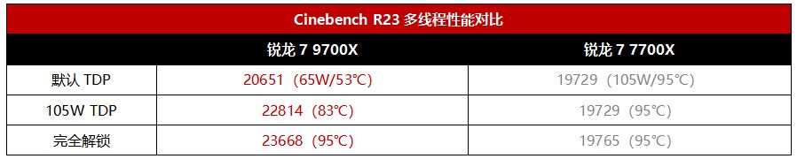 性能方面,可以看到,在105W TDP設置下,銳龍7 9700X的Cinebench R23多核得分爲22814,相對默認65W TDP又有10.4%的提升,和完全解鎖功率牆下的得分相比,差距只有3.7%,但是溫度卻低了12℃左右。由此可見,AMD將銳龍7 9700X的默認TDP解鎖到105W是仔細考量了性能、溫度和功率完美平衡的,在105W TDP下幾乎能實現完全解鎖的多線程性能,但溫度卻可以控制在更安全的範圍內,綜合表現更加出色。