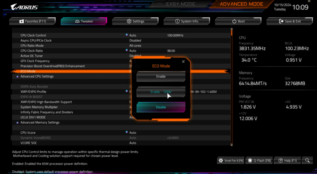 ▲更新到最新版BIOS後,在主板BIOS的Tweaker頁面下,可以看到ECO Mode的選擇,在這裏選擇105W模式即可