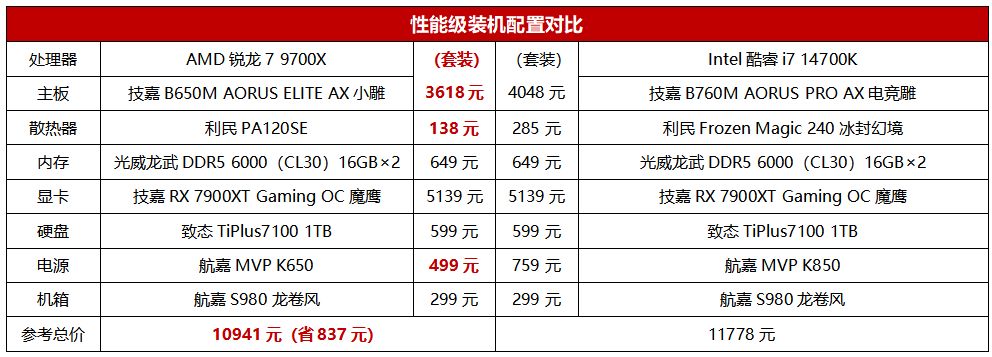 此外,從我們列出的裝機配置可以看出,對於追求性能級遊戲裝機的玩家來講,銳龍7 9700X平臺不但處理器和主板套裝價格有優勢,由於供電和散熱需求更寬鬆,所以散熱器和電源方面也可以節約更多的裝機預算,如此一來整機價格就相對酷睿i7 14700K平臺有了837元的優勢。考慮到銳龍7 9700X本身在綜合遊戲性能方面相對酷睿i7 14700K也有優勢,這套配置的性價比就更加突出了。那麼,最近想在雙十一裝機的朋友,如果要打造一套主路性能級主機,那麼銳龍7 9700X確實是非常值得優先考慮的高能效之選。