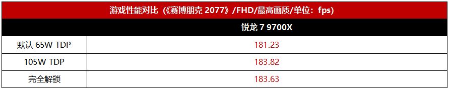 銳龍7 9700X的遊戲性能方面,其實解鎖TDP帶來的幀率變化並不大。原因就是絕大多數遊戲本身對處理器的佔用率並不會特別高,所以處理器的實際遊戲功率也並不高。從我們首發測試的數據來看,完全解鎖功率限制的銳龍7 9700X在各種遊戲中的功率保持在100W左右,最高也不過110W水平,而解鎖到105W TDP的銳龍7 9700X完全滿載的封裝功率可到140W出頭,很顯然玩遊戲根本用不到那麼高的功率,所以105W TDP發揮全部遊戲性能是綽綽有餘了。因此,對於遊戲玩家來講,選擇105W TDP也算是個黃金平衡點,65W TDP(滿載88W封裝功率)性能釋放稍低了一點,完全解鎖滿載160W封裝功率遊戲又用不到那麼高,105W確實剛剛好,遊戲性能滿血輸出,還更省電。