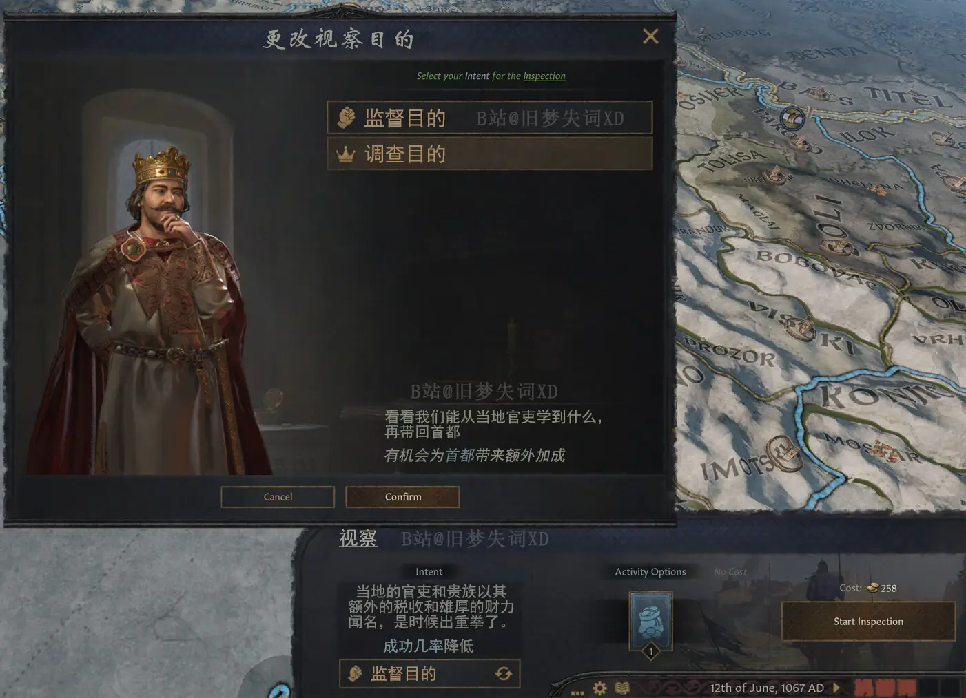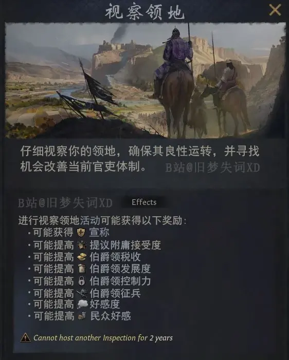 如圖,從目前透露圖來看,視察領地有兩個目的,分別爲監督目的和調查目的,而圖片展示了監督目的能通過視察地方,爲首都添加增益buff。