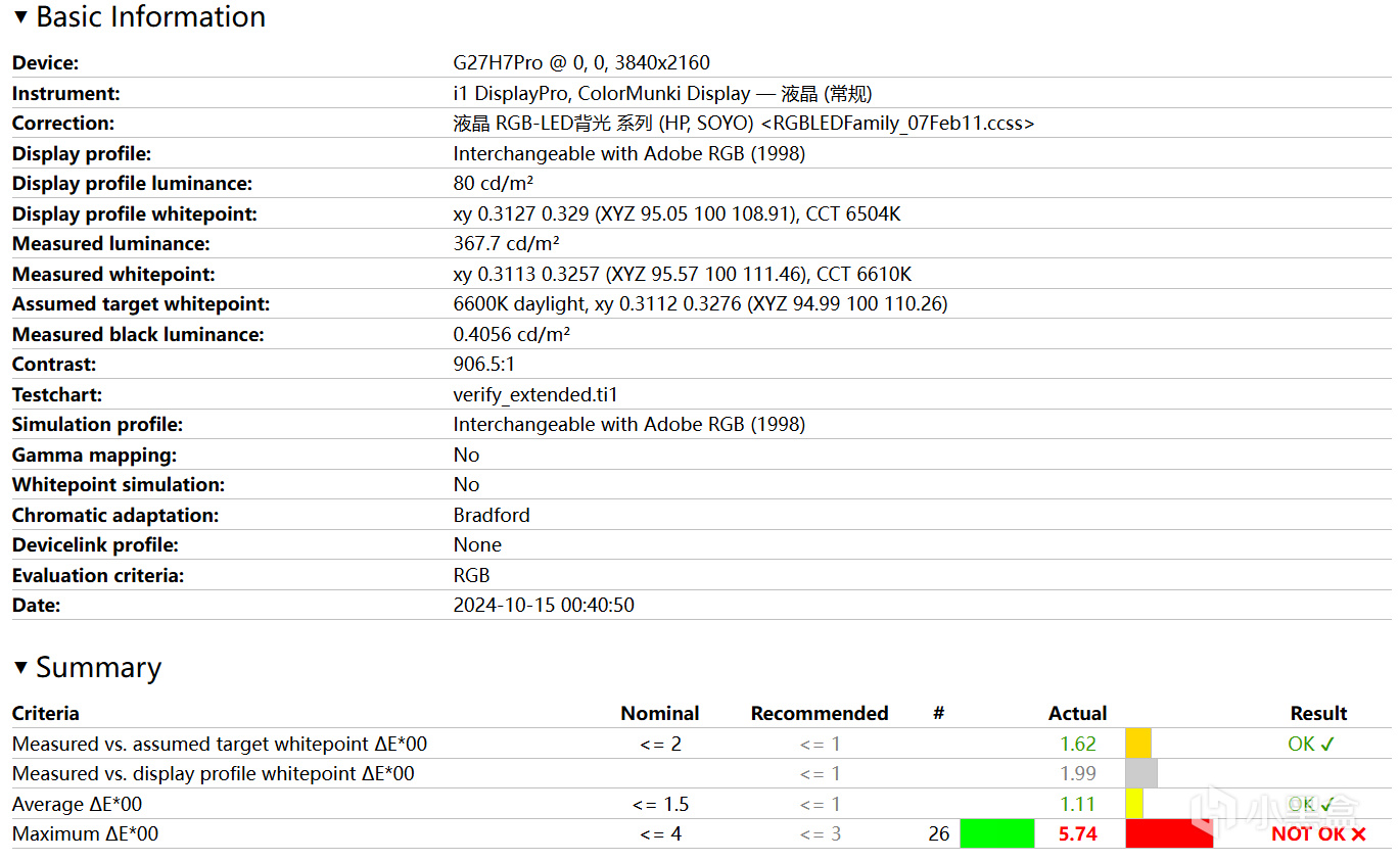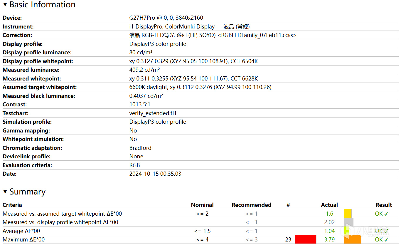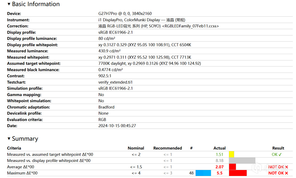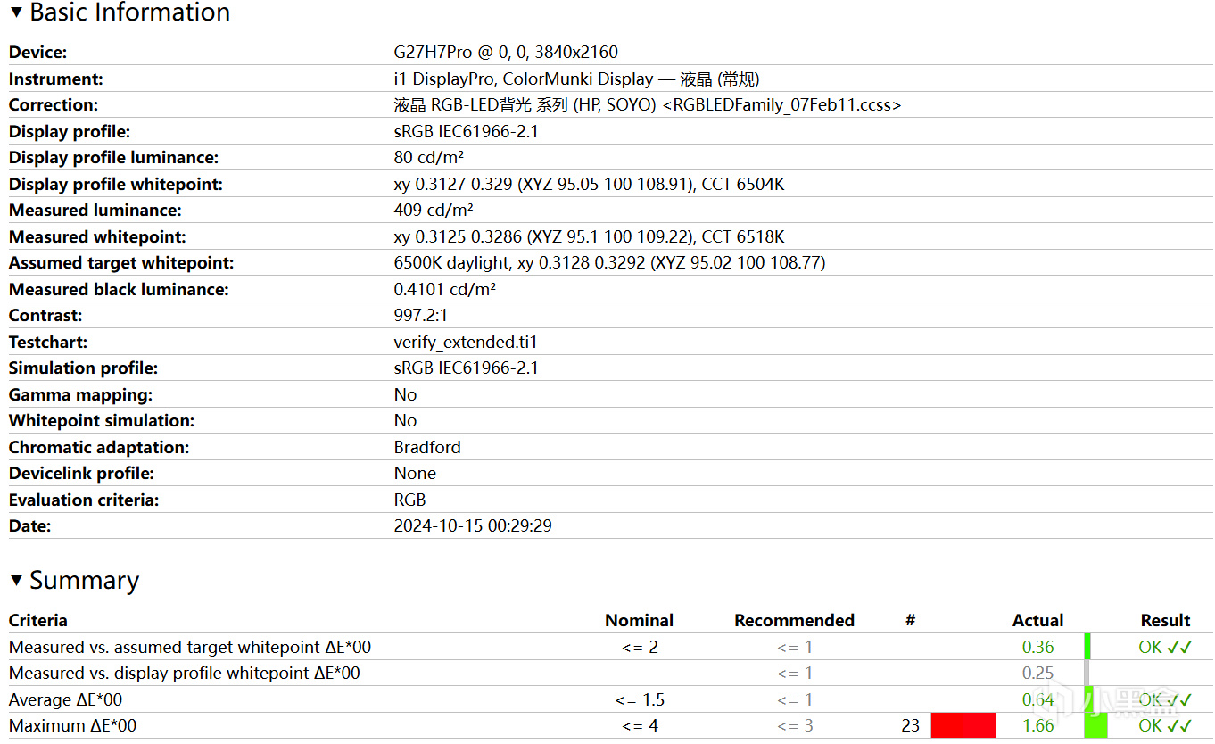 而在Windows環境下,在沒有ICC的情況下使用P3色域會過飽和。通常不建議使用,在加載ICC後,85%的P3色域覆蓋也只能說勉強能用的狀態,但即使如此,這臺HKC G27Pro的色準依然做到了△E1.04,值得稱讚。