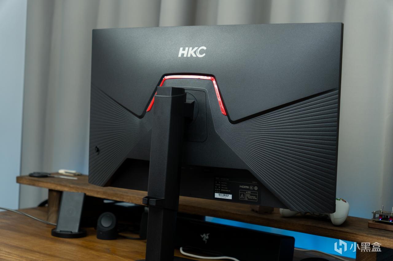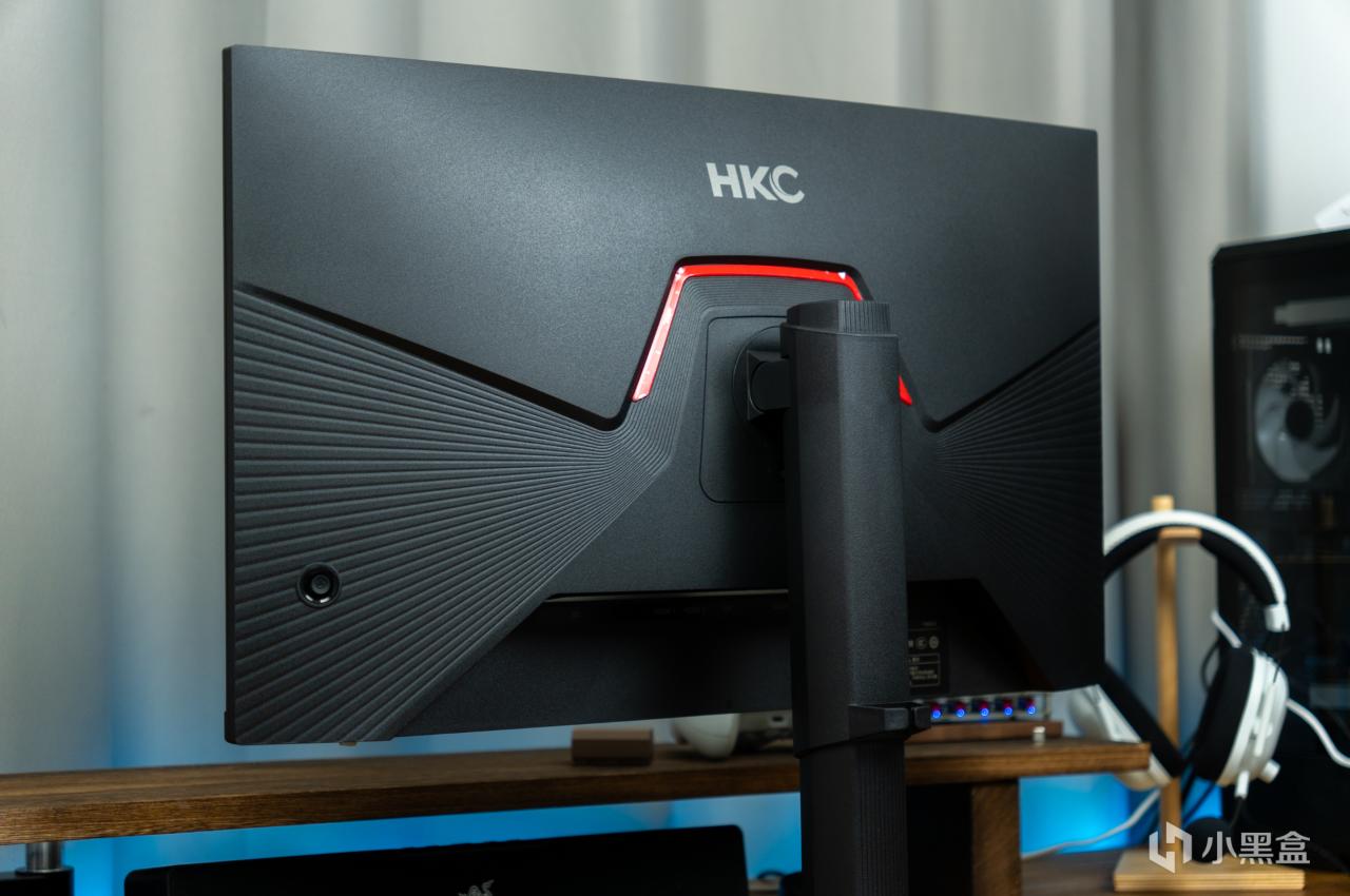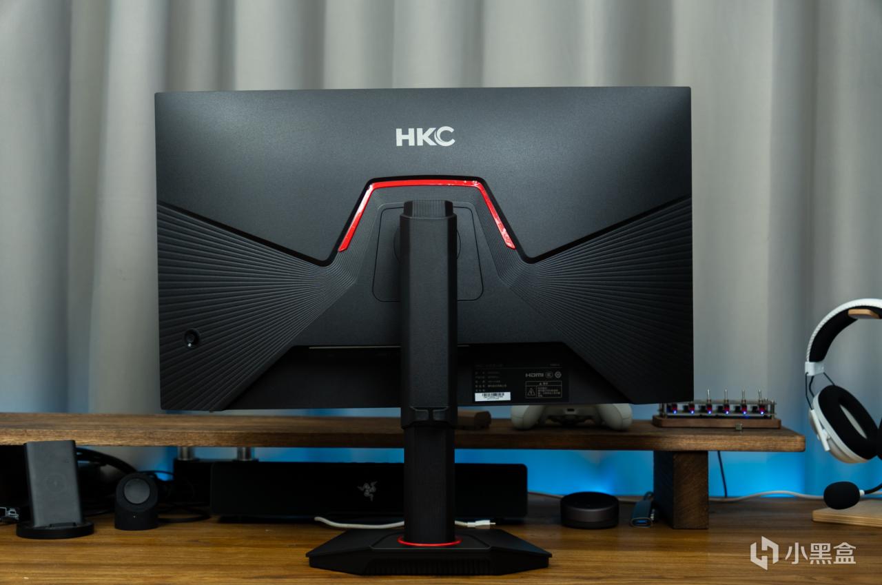 顯示器背板爲純黑色,正中央上方噴吐着HKC Logo,中央支架部位有紅色裝飾件點綴。