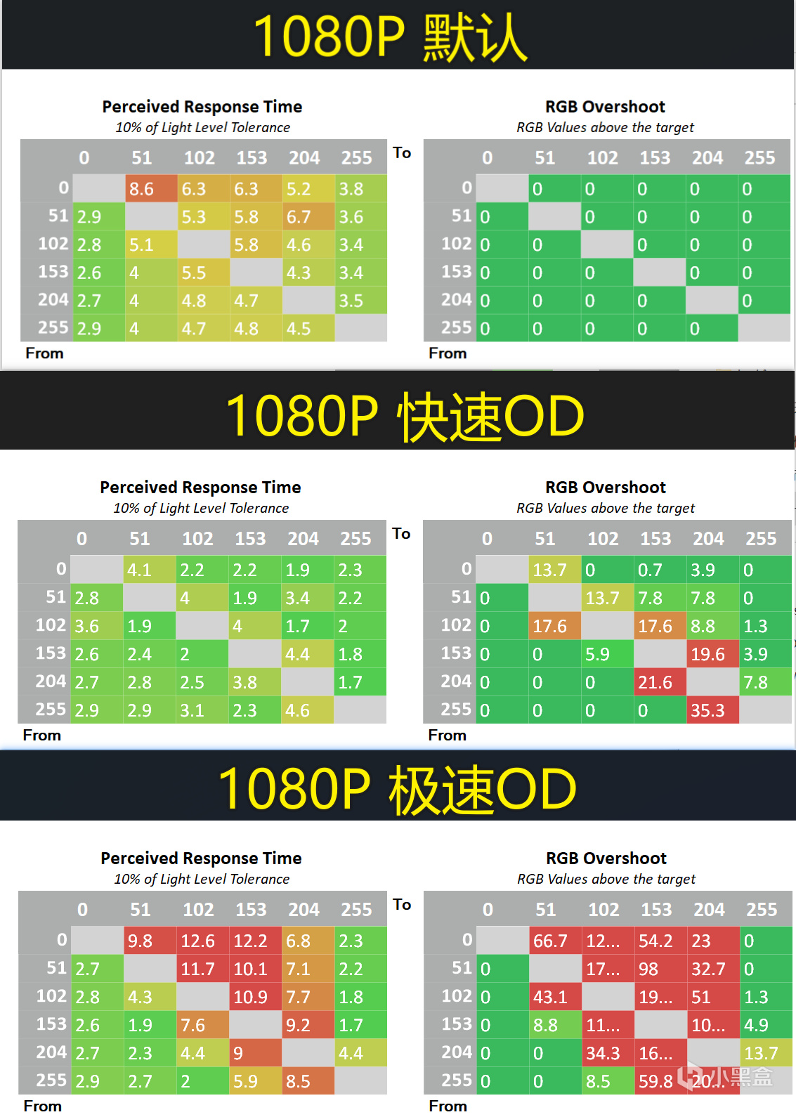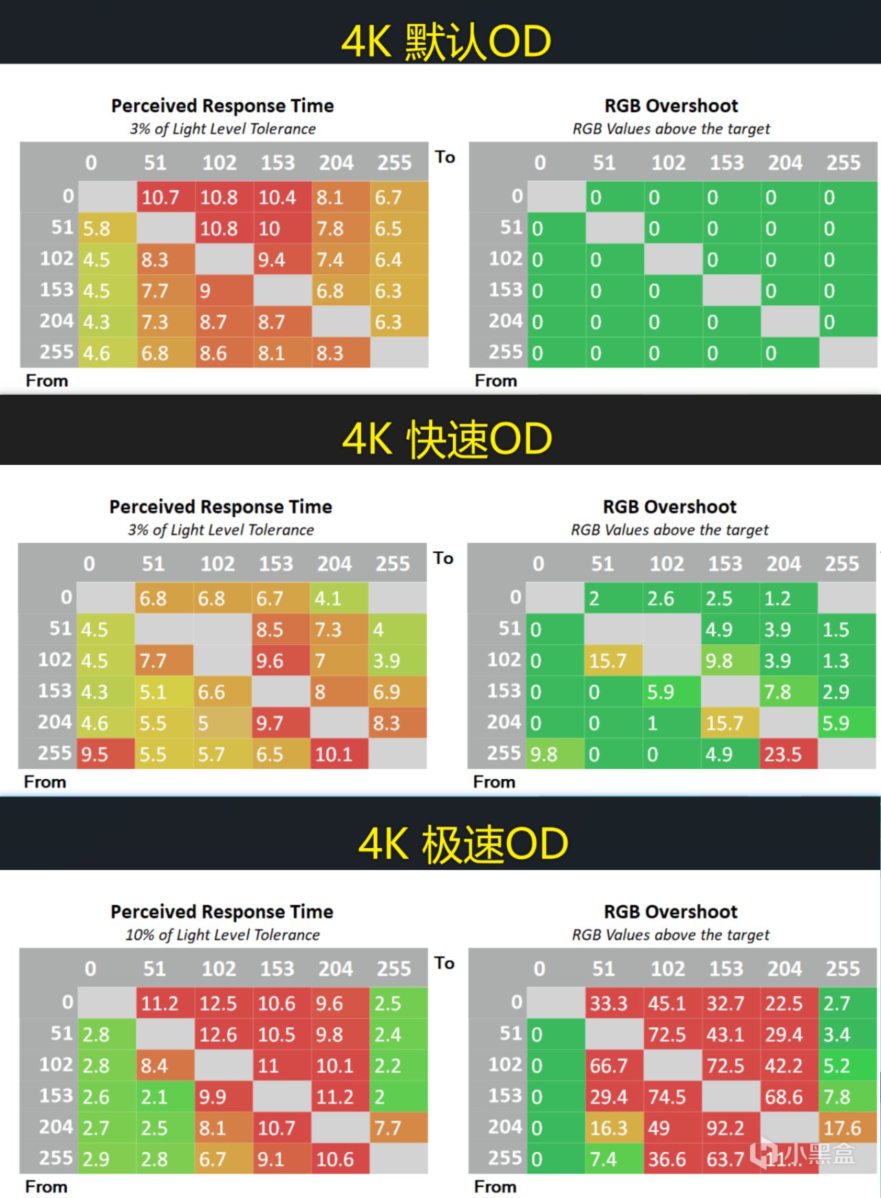 可以看到在1080P分辨率下,無論是標準響應時間還是MPRT響應時間相比4K 均有不小的提升,在可用的快速檔位下,3.32ms的MPRT響應時間已經可以比肩一些TN屏幕。