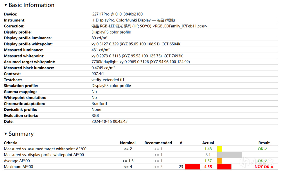 -DisplayP3色準平均△E1.37,最大△E 4.55。
