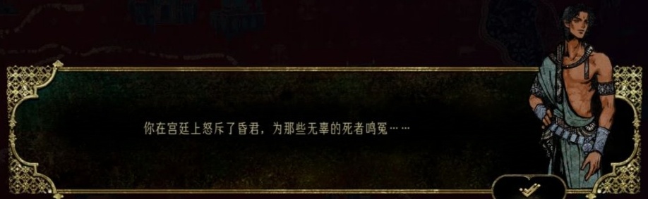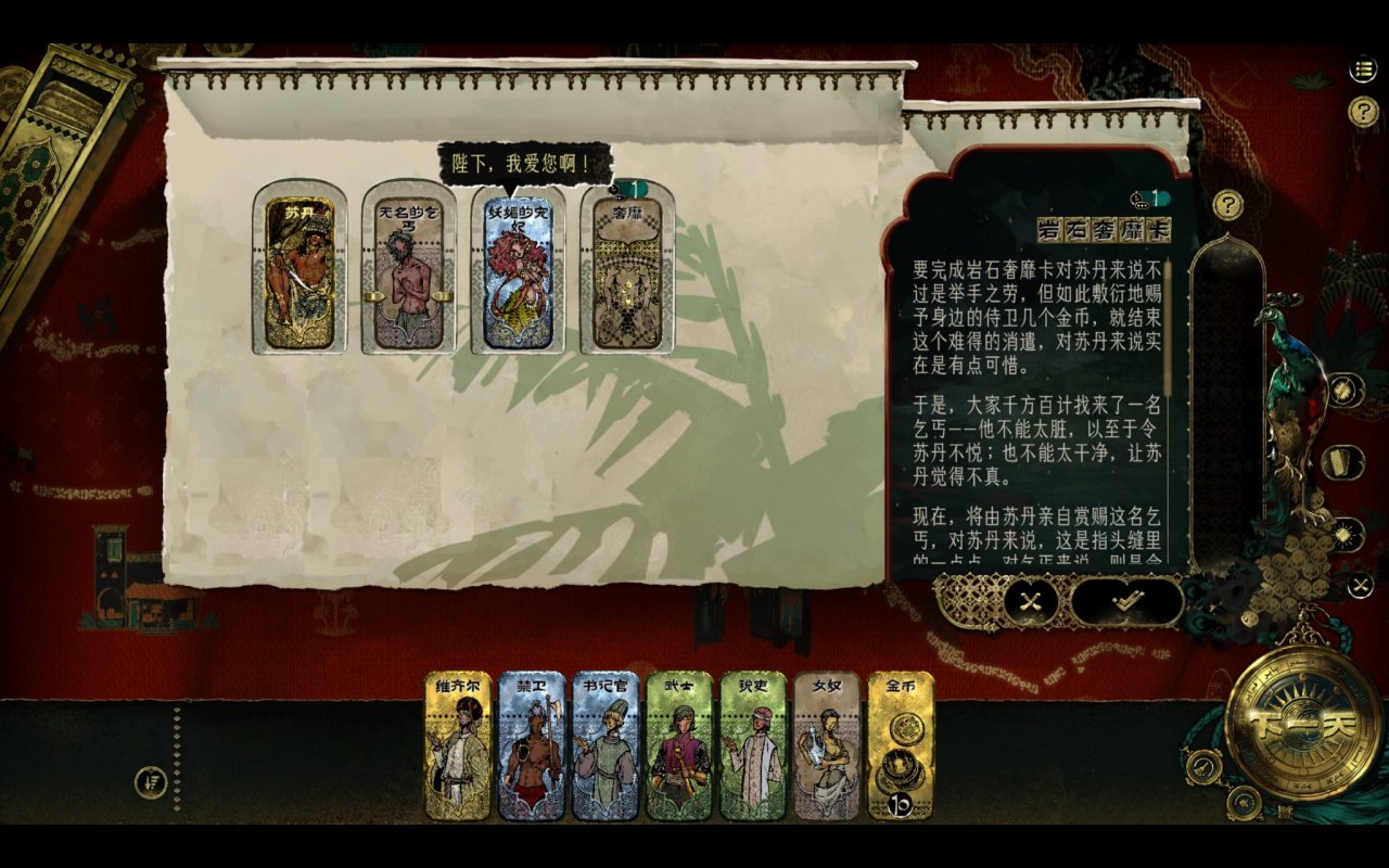 見證了這些天的悲劇,蘇丹身邊的大臣一個又一個的離他而去,你實在無法看着王國繼續這樣發展,你決心要向蘇丹勸諫,於是你在宮廷上怒斥了昏君,爲那些無辜的死者鳴冤… 儘管你知道機會渺茫,但如今大臣們都一片緘默,如果你不做些什麼,這將永遠無法改變。