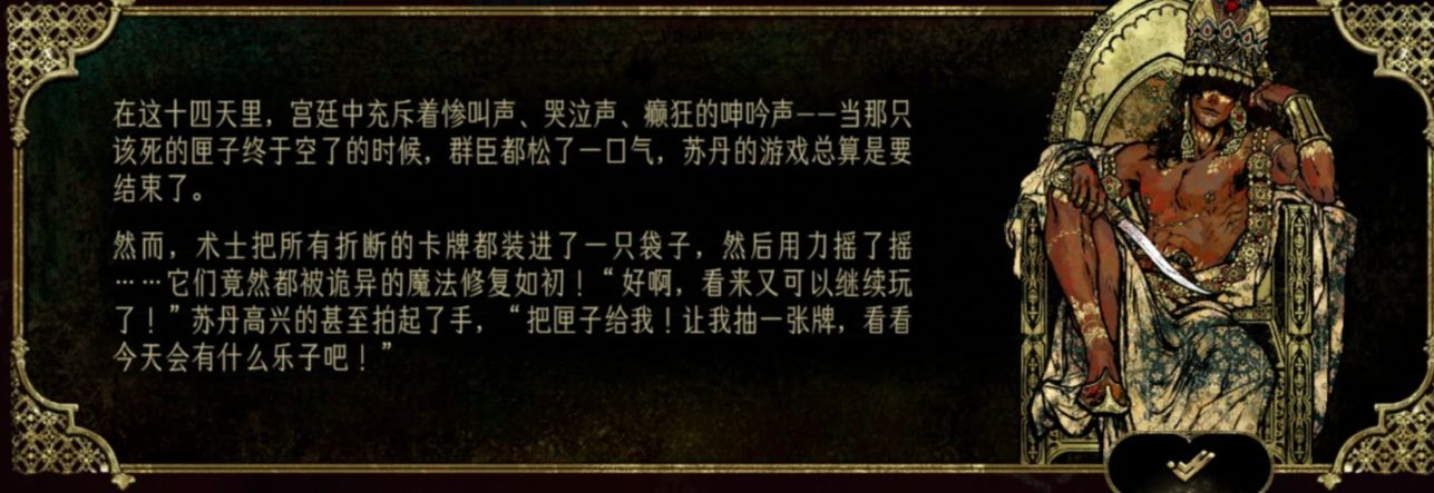 蘇丹把選擇玩家也當做了遊戲的一部分,他強迫你代替他進行這些殘酷的遊戲,蘇丹赦免了你爲了完成卡牌可能犯下的罪行—殺人、通姦、搶劫和屯兵,他這麼做可不是因爲他對你格外仁慈,他這麼做,只是希望你在遊戲中表演的更加精彩。請記住你只有七天的時間來完成一張蘇丹卡,如果拖到第八天,他會隨便砍下你的頭顱。