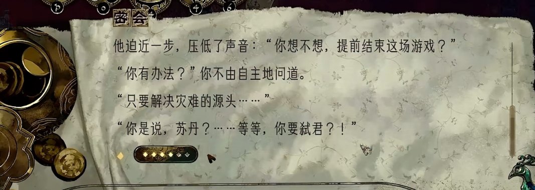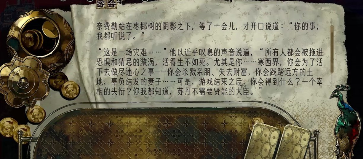 在此之後你帶上了銅書籍去拜訪了最近一直神神祕祕的政敵奈費勒,他邀請你一起去一個偏僻的地方密會,你完全可以藉此機會這殺了他或者對他做一些不可告人的事,但是你並沒有,你好奇這樣一位政敵找上你究竟是爲何原因,你的耐心和好奇心爲你帶來了回報