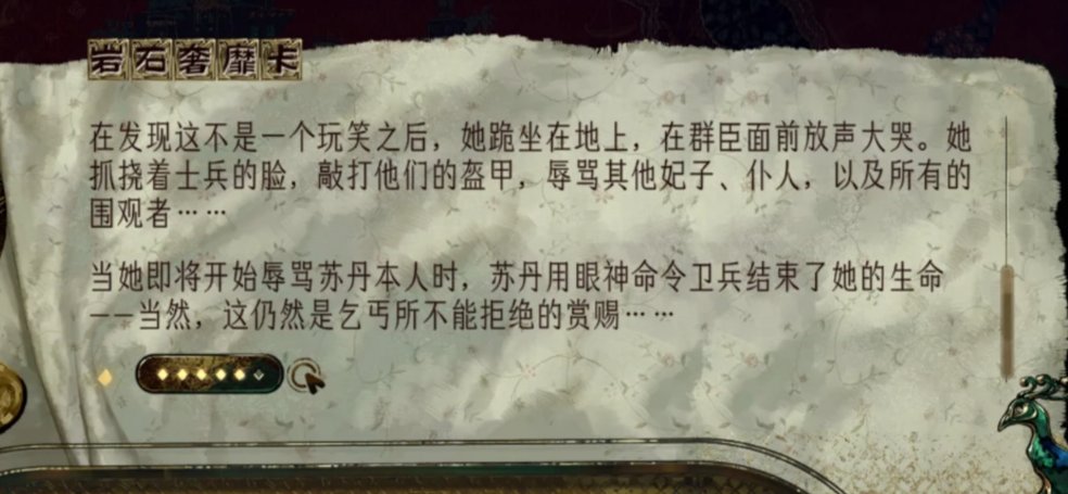 “我們不能再這麼下去了,在這樣下去你會墮落成爲下一個暴君,或者某天因無法完成蘇丹卡而慘死,我無法想象某天回家後聽聞我的丈夫在宮廷上處死,而我只能爲你收屍。”說着湧出的淚水打溼了妻子的眼眶,她的聲音帶着哭腔