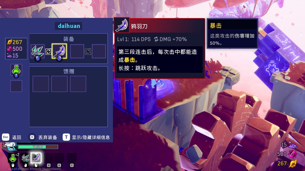 但是這個儘量就遠程放完之後用鴉羽刀收割就完了,(這個苦無(版本bug武器)積攢完事之後,閃避之後給交替攻擊的時間太短了)新手的首選武器組合。打boss挺爽。也可用弩但是得是配合初始大刀(大刀三下交替攻擊,其他武器時間長,弩不需要收割本身傷害高)。