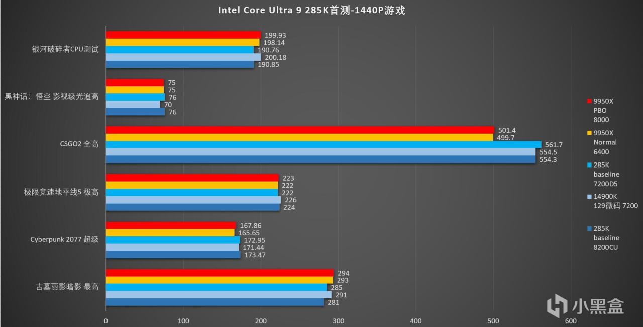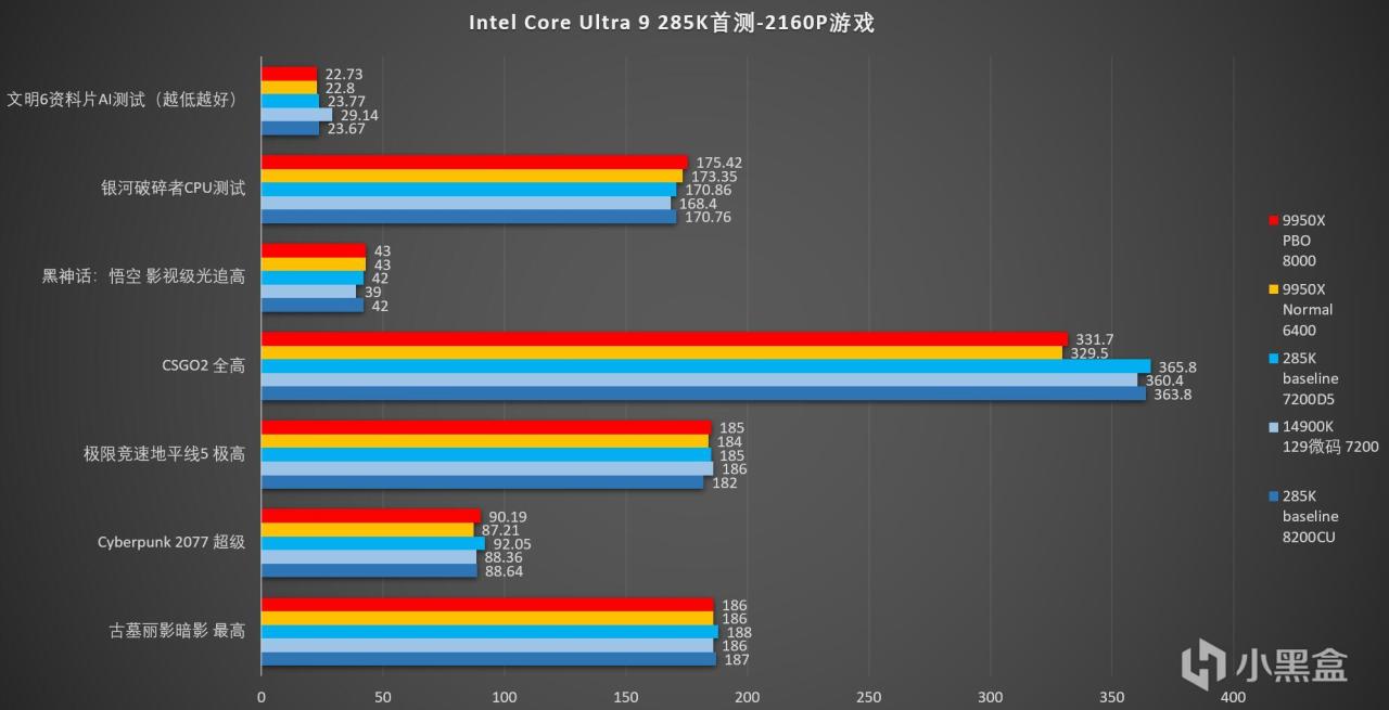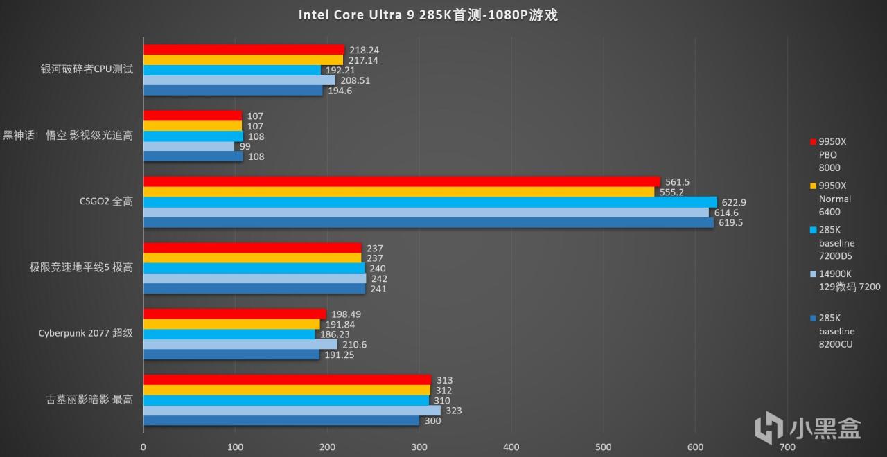 最后则是比较难绷的部分:游戏性能。Intel倒是在前几天的发布PPT中比较诚实地宣布了游戏性能一般,不过实际成绩测下来确实有点搞笑,不仅和对面游戏性能公认不太行的9950X打得有来有回,甚至有的游戏还不如14900K,最尴尬的是寄予厚望的8200CUDIMM超高频内存,平均游戏性能是低于普通的DDR5 7200内存的,个别游戏能赢一丢丢,但是输的就更多了!总体来说,如果是单纯打游戏的话,确实没必要换新平台——要换,也不是现在换,起码等更高频的CUDIMM出来再说,现阶段是又贵又倒吸,这谁受得了!