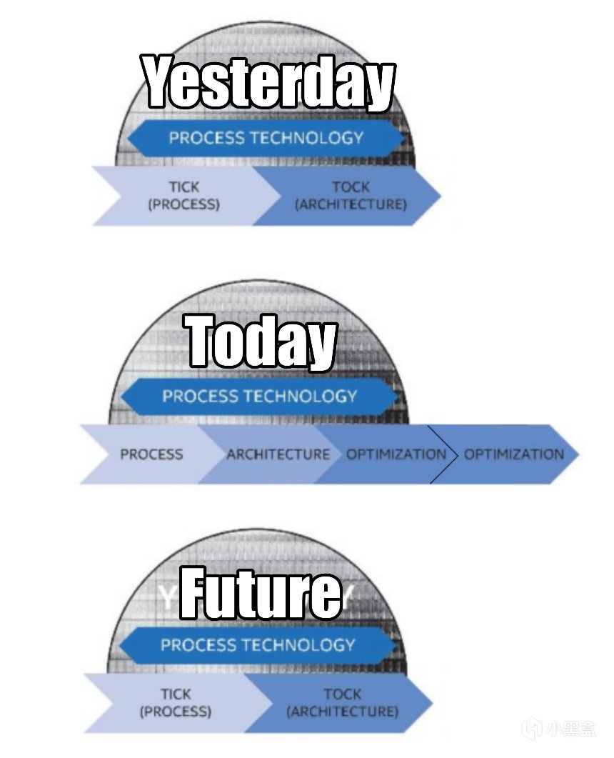 当年在PC业界,在著名的“摩尔定律”渐渐无法适应业界的发展之后,Intel提出来过一个“Tick-Tock”战略,最初是计划将CPU的更新拆分成像钟摆左右摆动一样的两个阶段,即工艺更新的“tick”阶段,以及架构更新的“Tock”阶段。