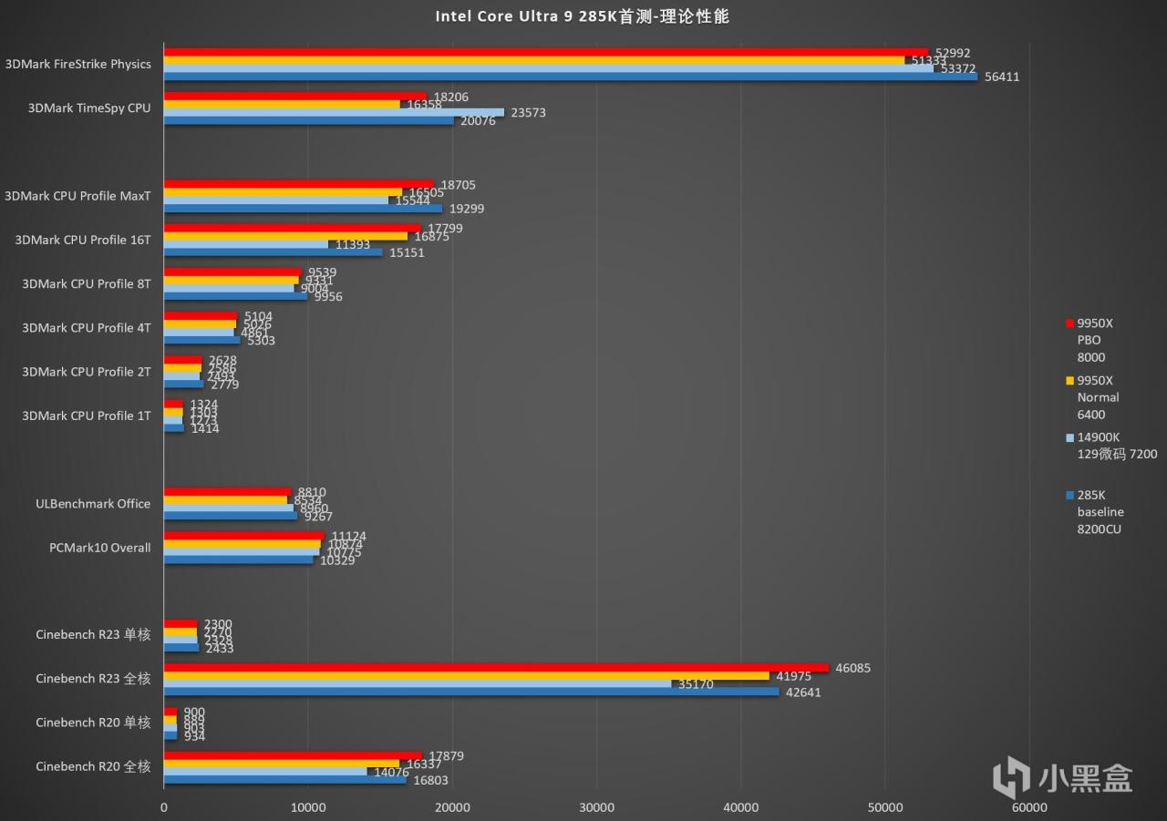 然后是进步还可以的部分:理论性能,尽管少了8个框框,功耗温度也低了,但是多线程性能确实是目前默认状态下最高的——高出了默认状态下的9950X一丢丢,恰如7950X vs 14900K那时一样,控制得可谓刚刚好,单核则继续当仁不让地拿下了头筹,但是领先幅度确实是越来越小了——毕竟这次频率上相比14900K还低了0.3GHz,单核心性能的提升被频率差距吃回去了一点。考虑到新的Arc核显和NPU对AI的加成(这个回头测),以及功耗的降低,如果是需要Intel平台的生产力装机的话,新的Core Ultra还是值得更换的。