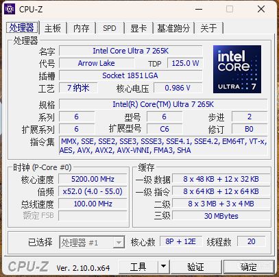 酷睿Ultra第2代這一代變化很大,取消了超線程後Ultra 7 265K的核心規格爲 20(8+12)核心20線程,P核睿頻最高5.5GHz,E核睿頻最高4.6GHz,E核性能大漲。