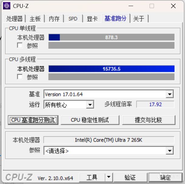 U7-265K CPU-Z 單線程跑分878.3,多線程跑分15735.5