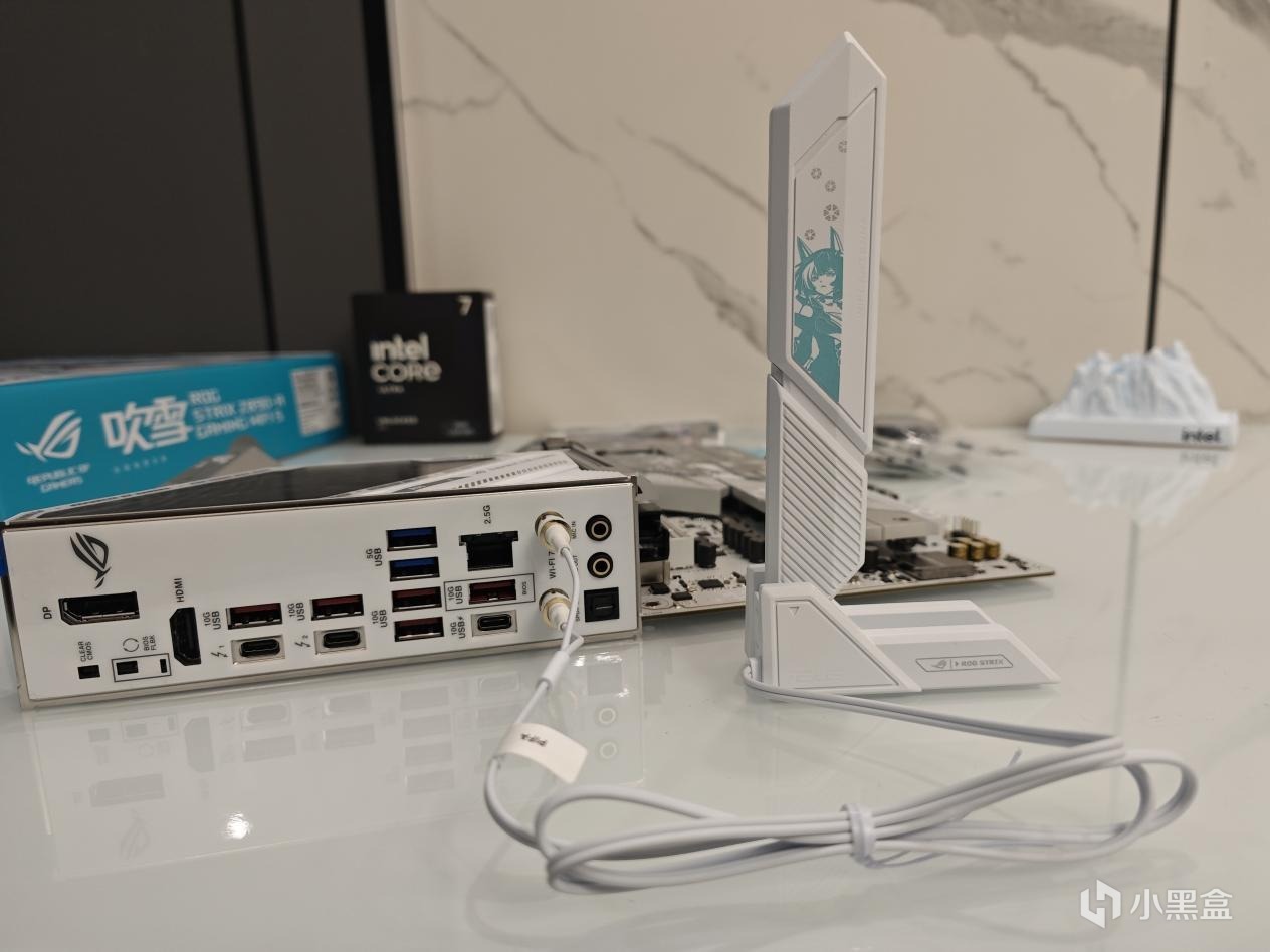 I/O面板ROG STRIX Z890-A Gaming WIFI S吹雪提供了1個DP、1個HDMI,4個10Gbps USB-A接口,2個雷電4接口,1個USB-C 10Gbps且支持USB-PD充電接口,另外還配備2個USB-A 5Gbps接口,1個2.5Gbps網口,音頻口和光纖口,Wi-Fi 7天線接口支持快易拆,安裝方便同時顏值也高,放在桌子上可以當個擺件。