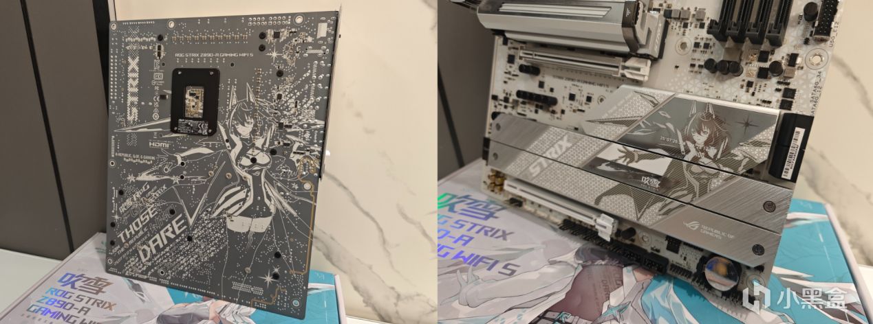 ROG Z890吹雪S這塊主板上天選姬無處不在,散熱裝甲上是天選姬,主板背部也增加了天選姬的設計,主板BIOS頁面設計了天選姬形象,開機ROG的logo也替換成了天選姬形象。