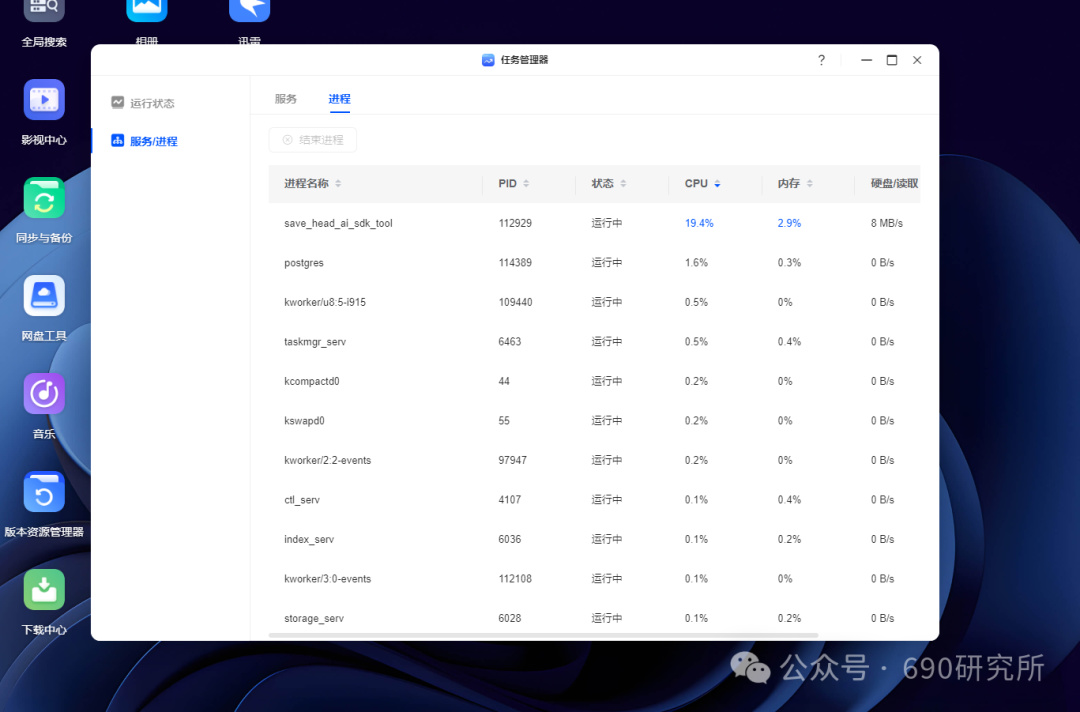 識別時進入到進程中可以看到,第一個就是相冊AI識別進程,這個佔用CPU性能還是挺高的,說明綠聯在這一版更新中優化了接口性能。