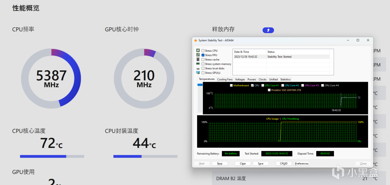 這裏開啓FPU,對14700KF烤機3分鐘以上,CPU在MSI寒霜D360水冷的壓制下,溫度可以穩定在72℃。