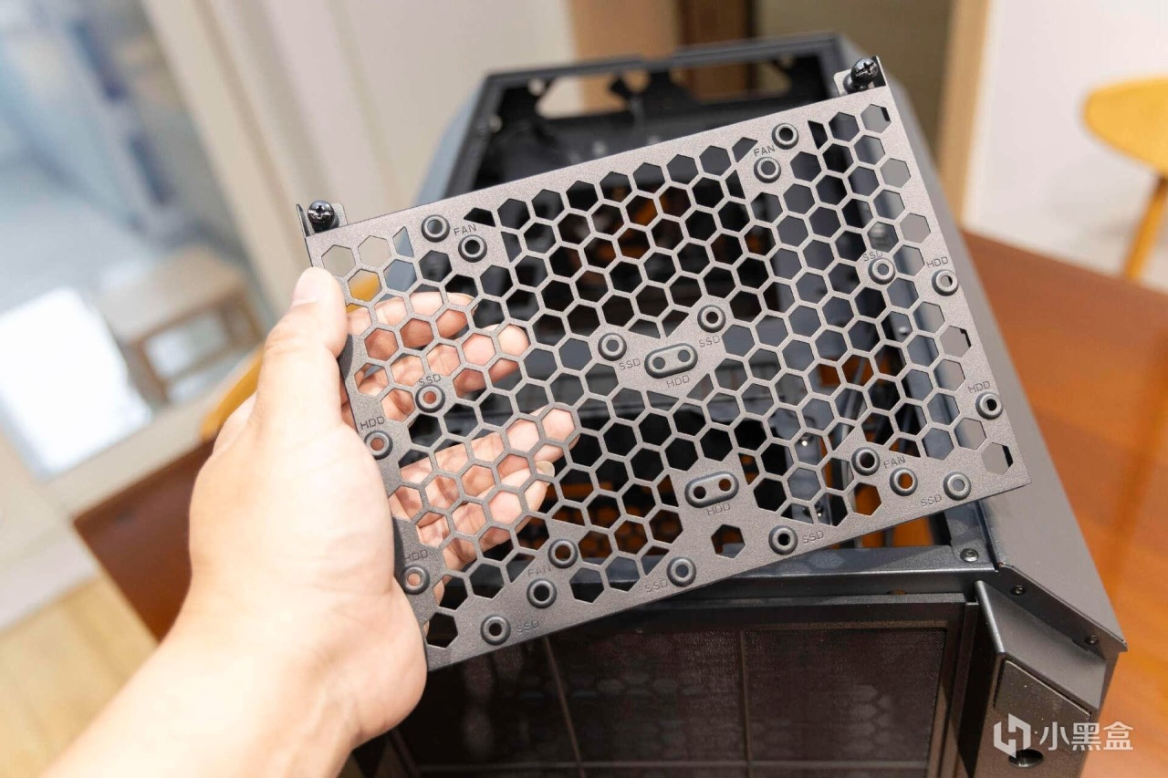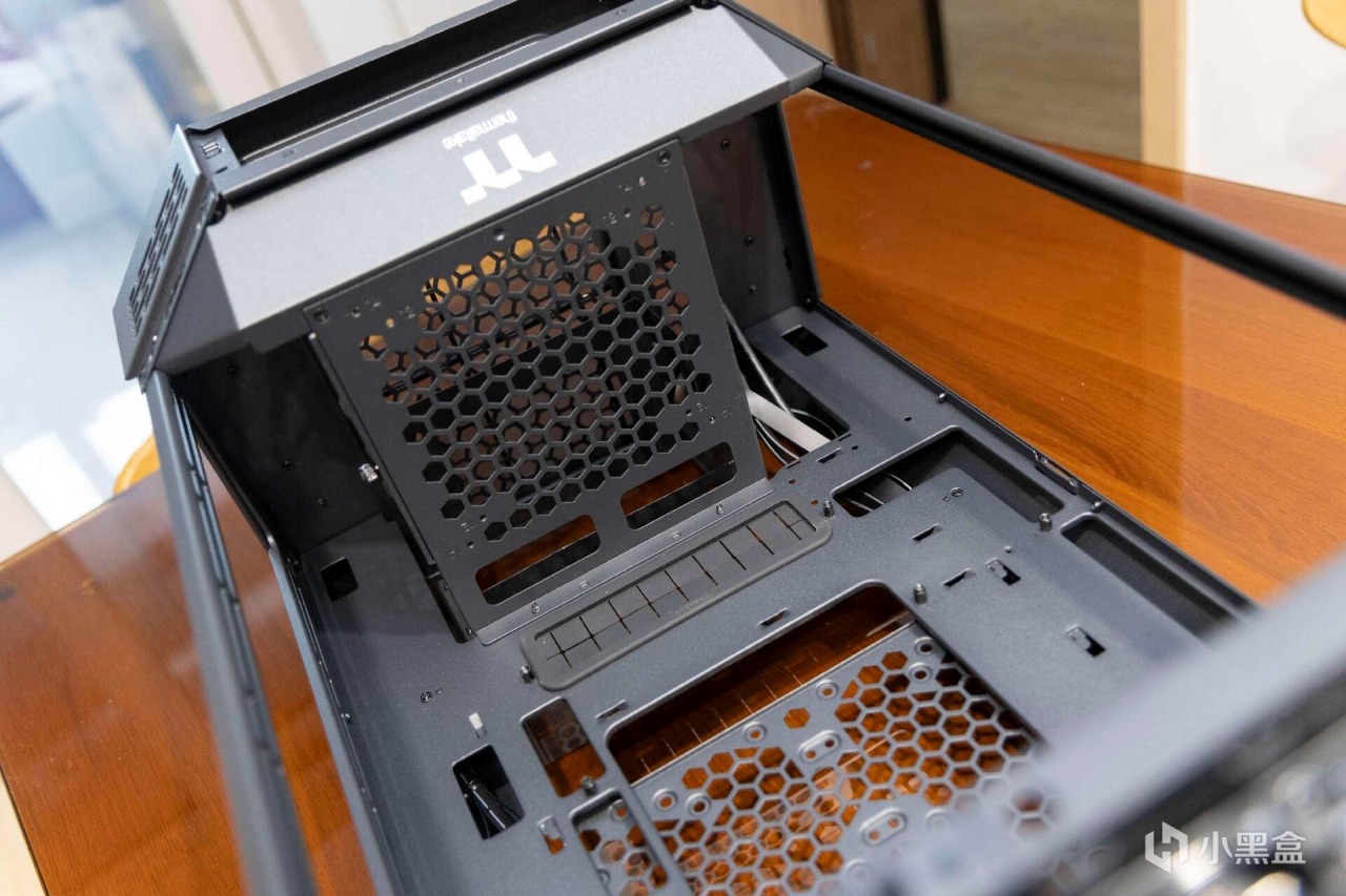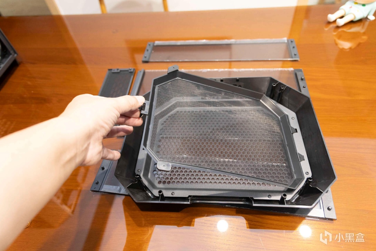 機箱頂部風扇框架同樣是模塊化設計,通過快拆螺絲可以輕鬆拆裝。箱底部設置了4個可拆式腳架,後期可以根據需要升級更換橫置蓋板。抽拉式的防塵防,防塵網面積相當的誇張,後期清理維護十分便捷。