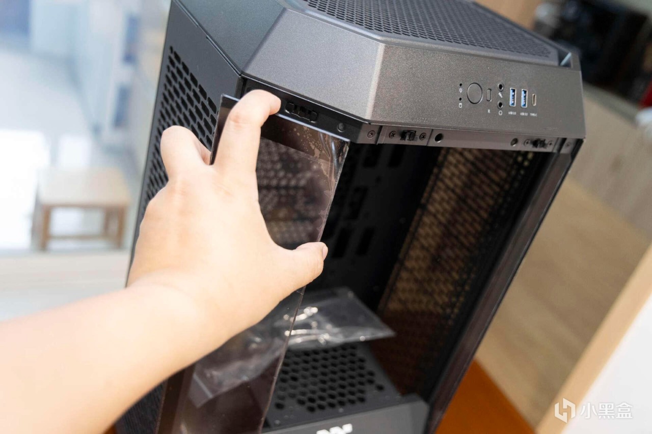 機箱的背部面板同樣採用了模塊化的快拆設計,背部翻蓋了全尺寸的防塵網進行防護。