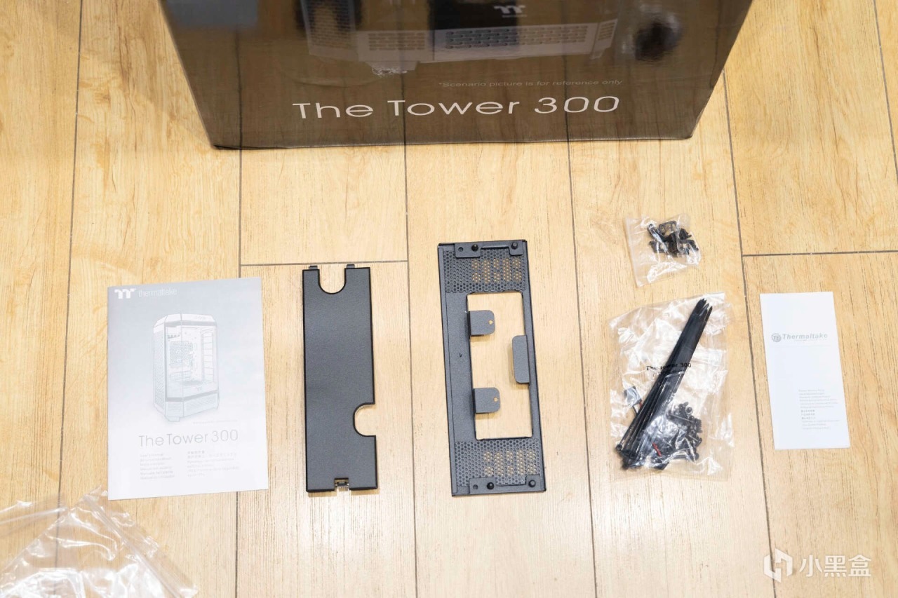 配件方面,Tt Tower 300機箱提供了額外的液晶面板支架(液晶面板需要額外採購),電源倉蓋板,配套螺絲,卡扣,綁帶等配件包,說明書和質保卡。