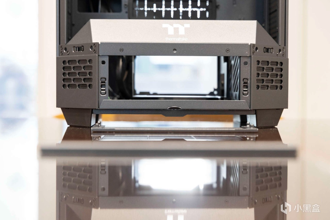 機箱底部電源倉正面的面板爲模塊化可拆設計,通過配套支架可以安裝額外的顯示面板。