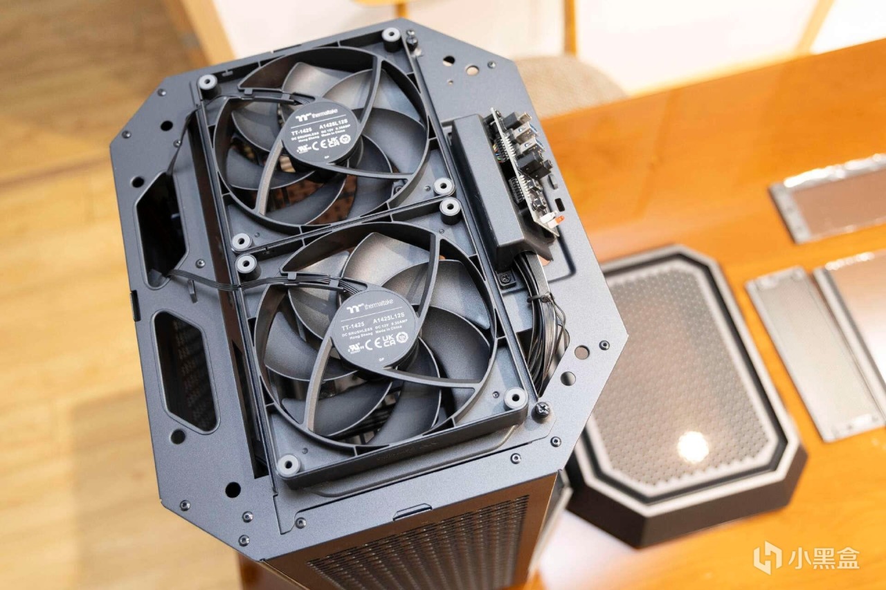 取下機箱頂蓋,可以看到Tt Tower 300在頂部已經安裝好了2把CT140 PWM高性能風扇,140mm的尺寸在風量和噪音表現方面都非常出色。