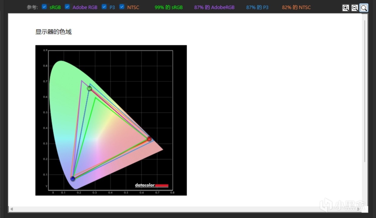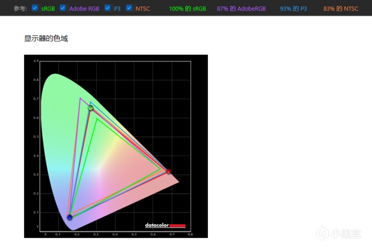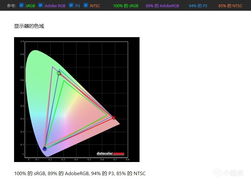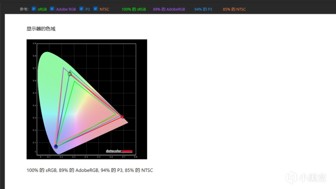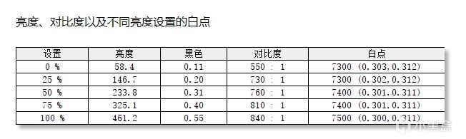 在1080P下實測,最高亮度爲461尼特,覆蓋100%sRGB,89%Adobe RGB,94%P3,85%NTSC
