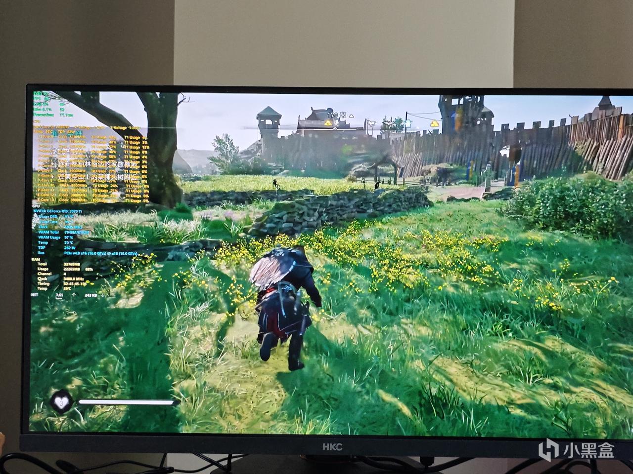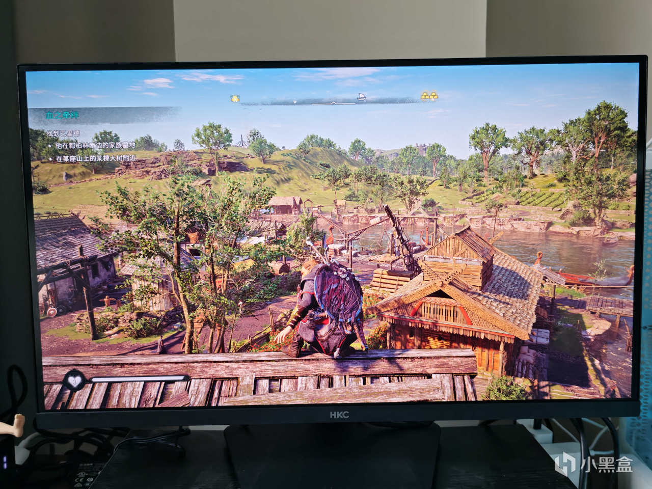 最近正好在玩《刺客信條:英靈殿》,4K分辨率還是玩3A最爽,可以看到艾沃爾盾牌上溝壑的細節清晰可見。遠處茅草屋還有近處的瓦片紋理都很清晰。