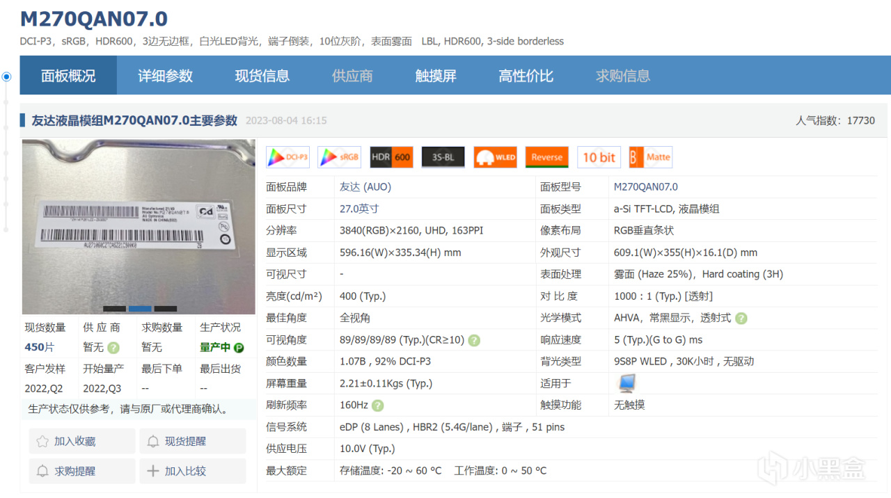 進入工程模式後可以看到面板爲M270QAN07.6,這個面板應該是目前首塊量產的雙模面板,一般叫友達7.6,原生3840x2160分辨率 160Hz刷新率