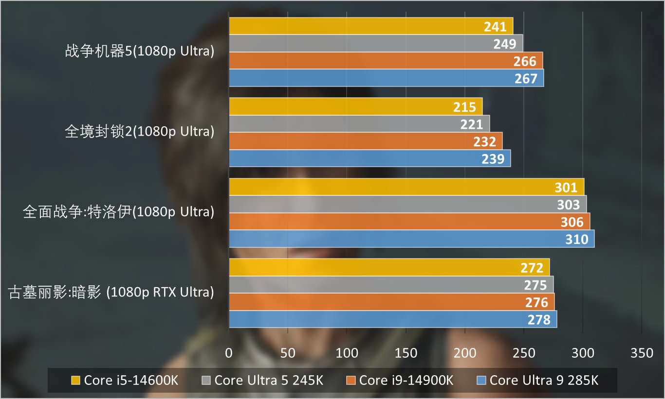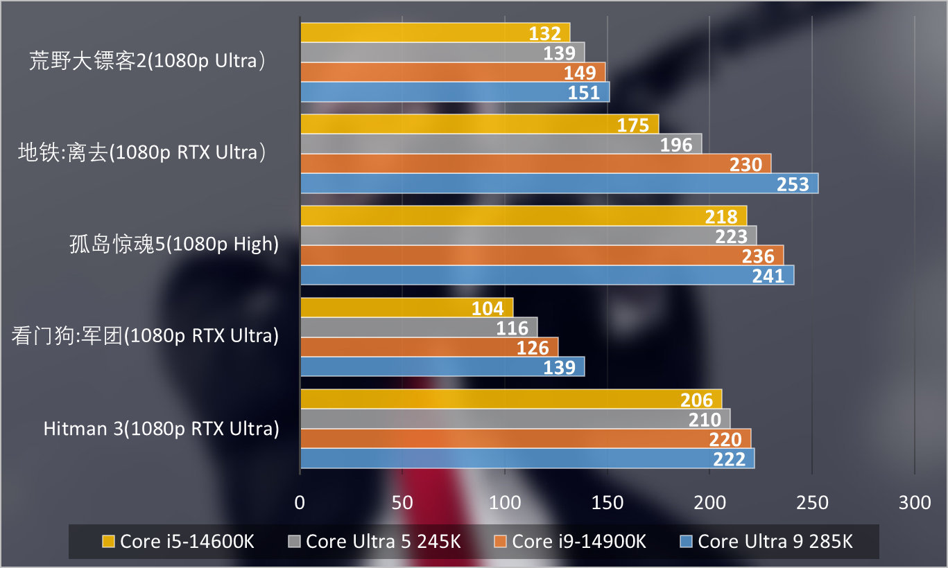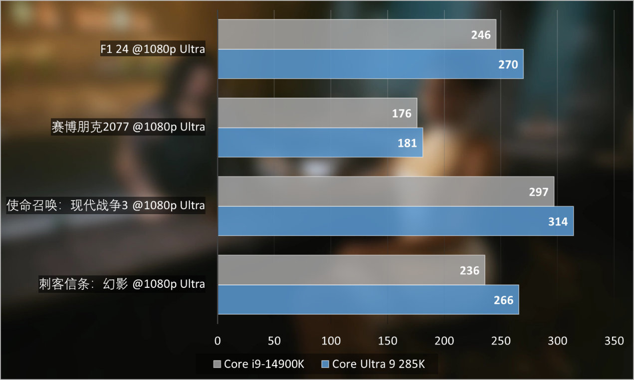 最后说说游戏。英特尔承认Arrow Lake的酷睿Ultra 200S在游戏性能提升上并非最大卖点,游戏性能提升大约在3%左右,这里我们直奔主题,对主流游戏进行测试,为了突出CPU的表现,游戏分辨率均设置成1080p最高画质,GPU使用的GeForce RTX 4090。