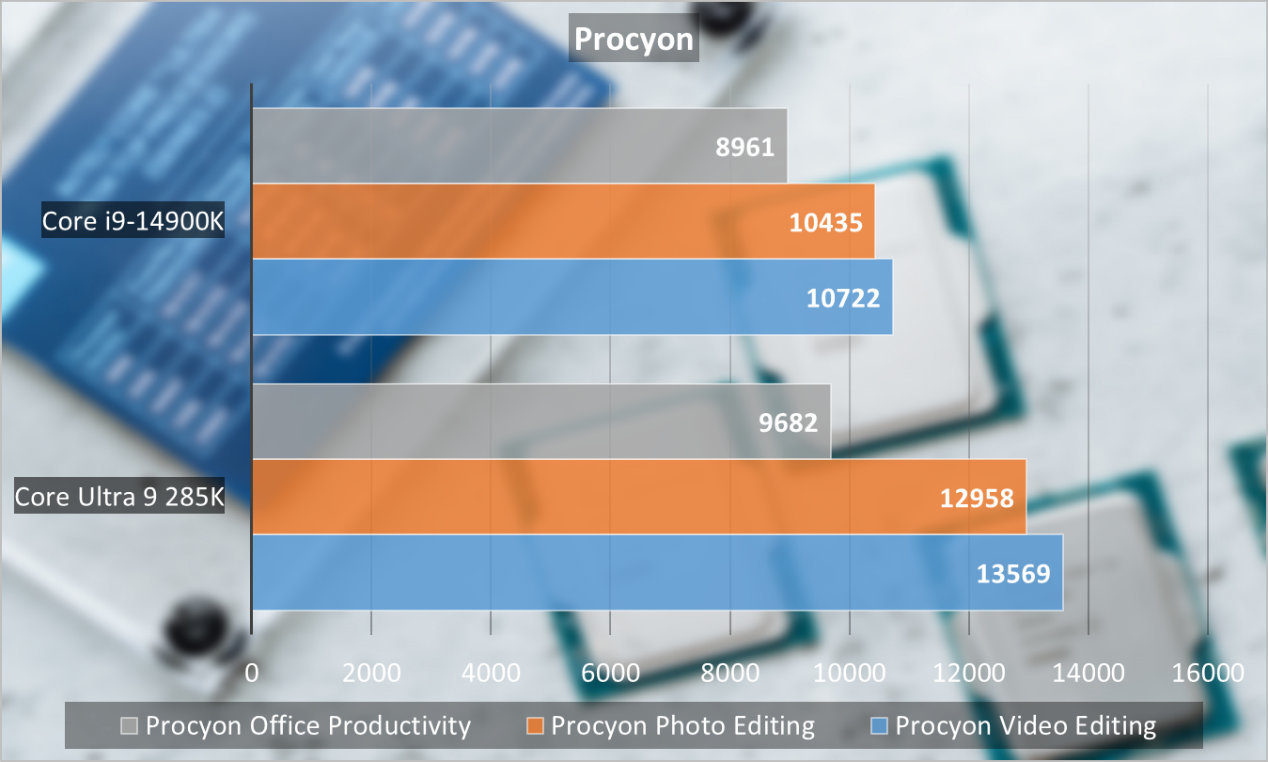另外我们也对Procyon Photo Editing和Procyon Video Editing,Procyon Office Productivity进行了检测,可以看到,酷睿Ultra 9 285K相对酷睿i9-14900K提升从8%到26.5%之间。