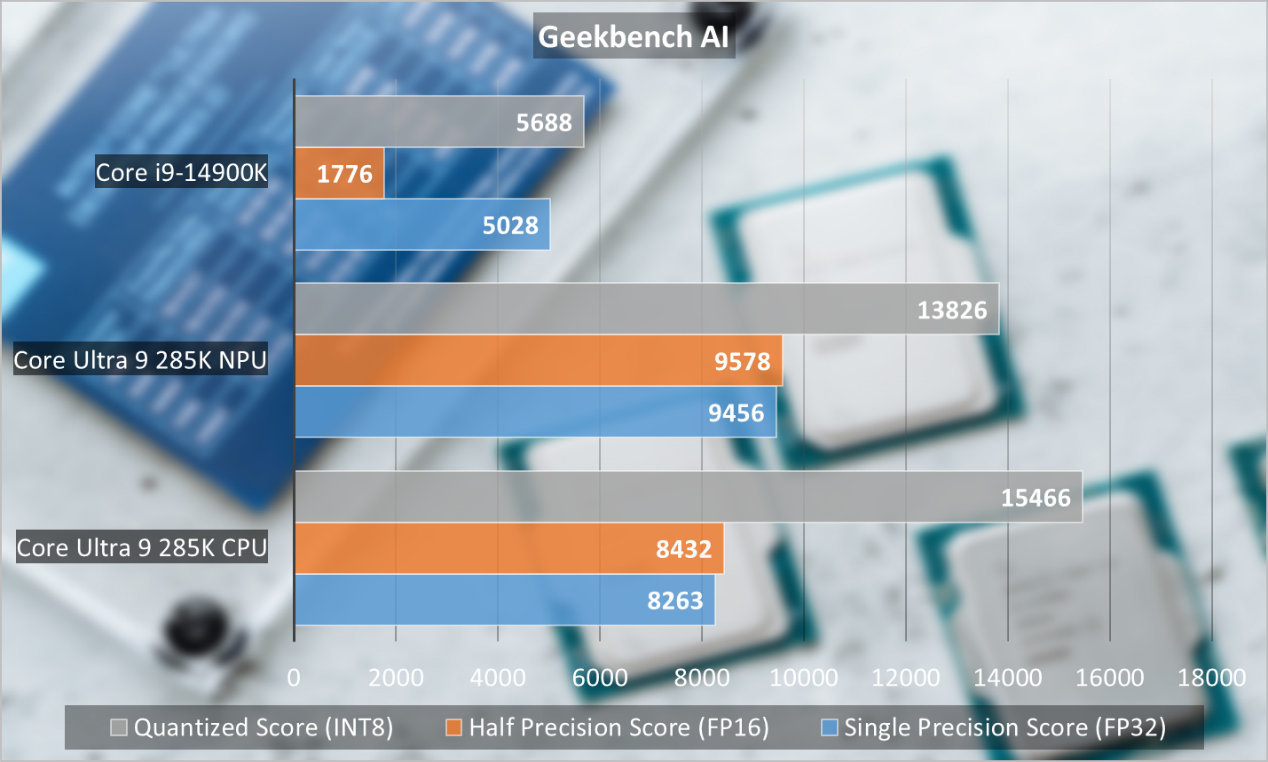 由于酷睿Ultra 200S系列是在桌面端第一次引入NPU,因此在部分应用环境中,酷睿Ultra 9 285K、酷睿Ultra 5 245K都可以仅依赖于NPU在低功耗状态下实现包括INT8在内的AI推算。