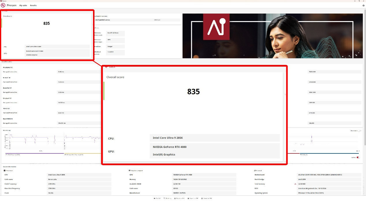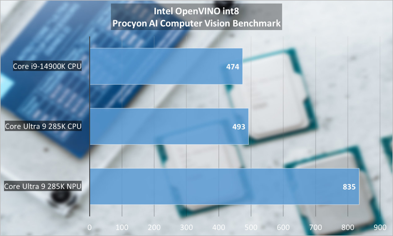 同样在Procyon AI Computer Vision Benchmark中,如果光依赖CPU性能,酷睿Ultra 9 285K提升不大,但如果是NPU加持,性能直接是翻倍的。