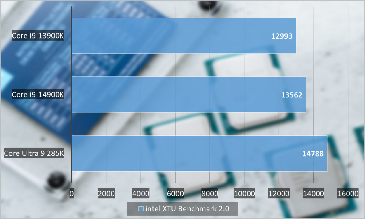 这里我们先用Intel XTU Benchmark 2.0作为判断基准,可以看到综合性能相对酷睿i9-14900K提升在7%左右。