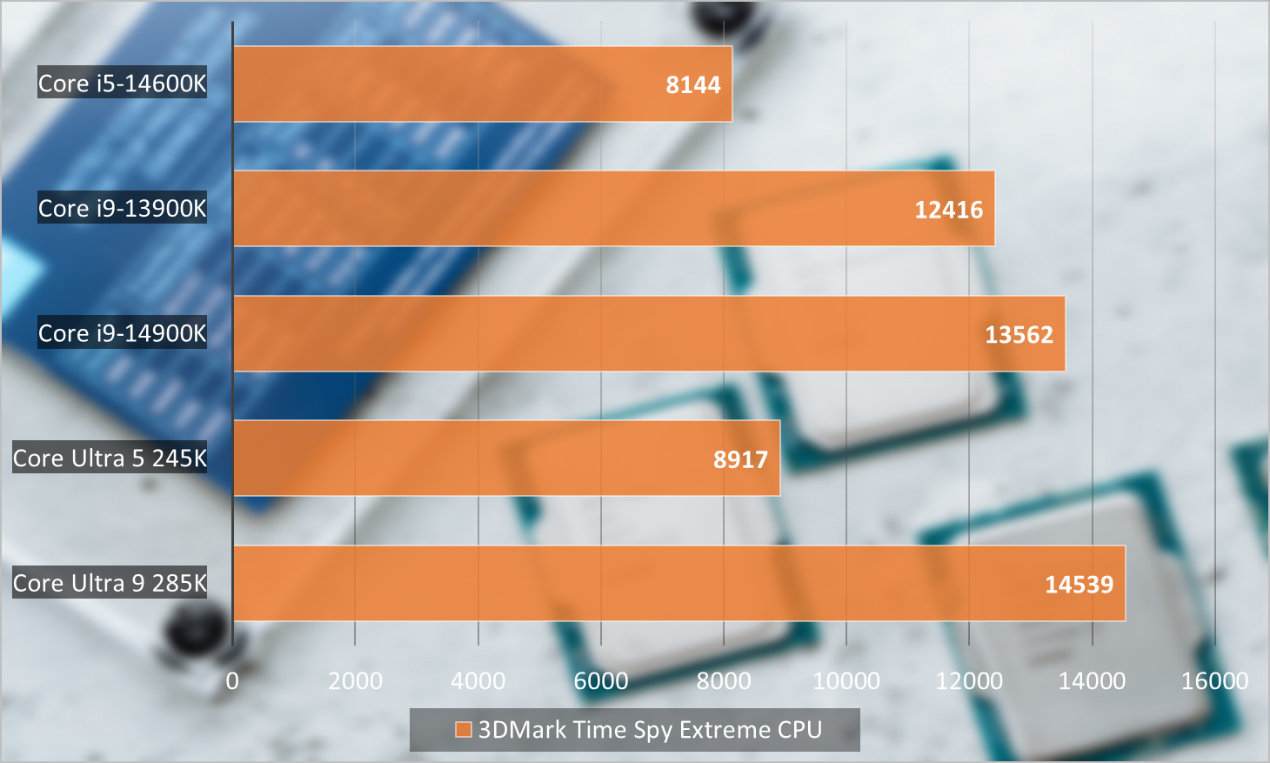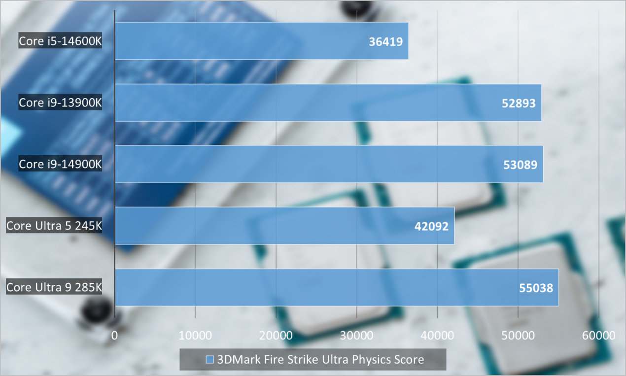 另外我们还测试了3DMark Time Spy Extreme CPU和3DMark Fire Strike Ultra Physics Score的表现,可以看到酷睿Ultra 9 285K相对酷睿i9-14900K提升3%到7%,酷睿Ultra 5 245K相对酷睿i5-14600K提升则要明显很多,可以从9%到15%。