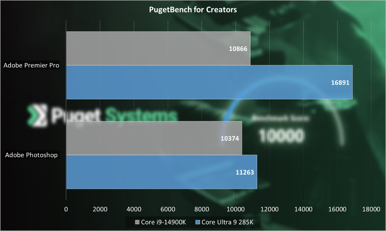在PugetBench for Creators - Adobe Photoshop测试中,酷睿Ultra 9 285K相对酷睿i9-14900K提升8%,但PugetBench for Creators - Adobe Premier Pro中差距就非常离谱了,酷睿Ultra 9 285K相对于酷睿i9-14900K可以达到55%的提升。