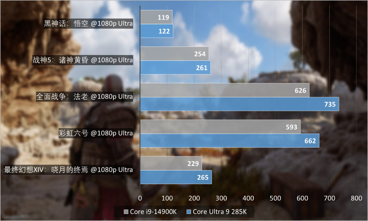 这里再着重对比一下酷睿Ultra 9 285K相对于酷睿i9-14900K之间的差距。在一些热门大作或者高帧率的游戏中,比如《彩虹六号》《全面战争:法老》,提升幅度最高可以到17%。当然也有差距不大的,比如《黑神话:悟空》提升不太明显。