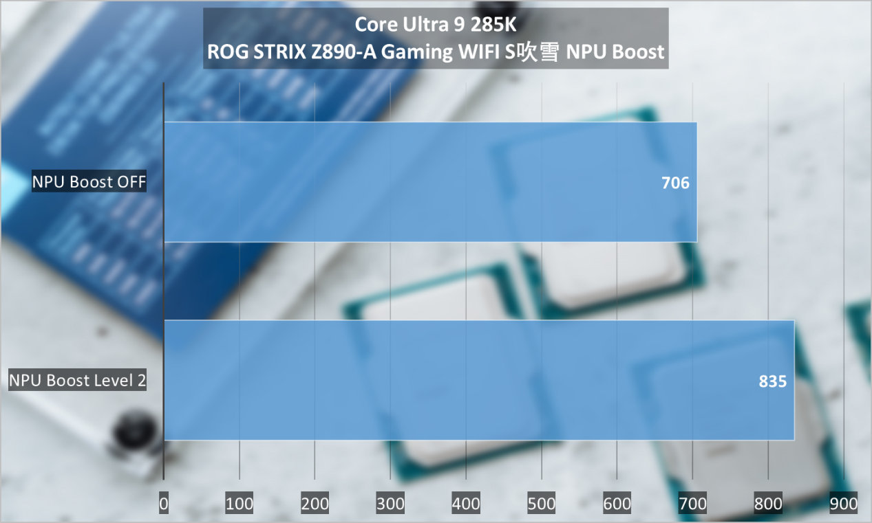 另外一个尝试则是NPU Boost,虽然酷睿Ultra 9 285K本身不提供NPU超频选项,但是ROG STRIX Z890-A Gaming WIFI S吹雪仍然提供了NPU超频的可能,通过NPU Boost功能,可以让NPU性能释放大约20%以上,而实际功耗仍然维持在9W左右。